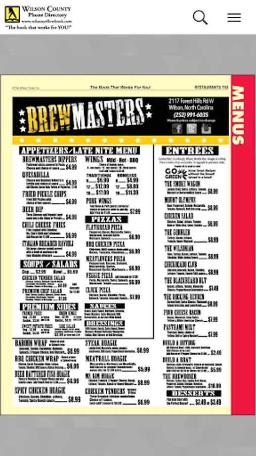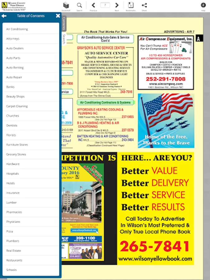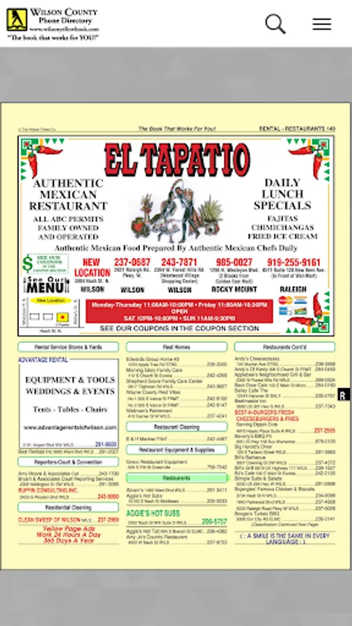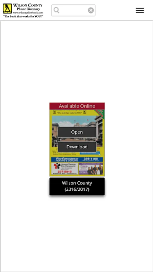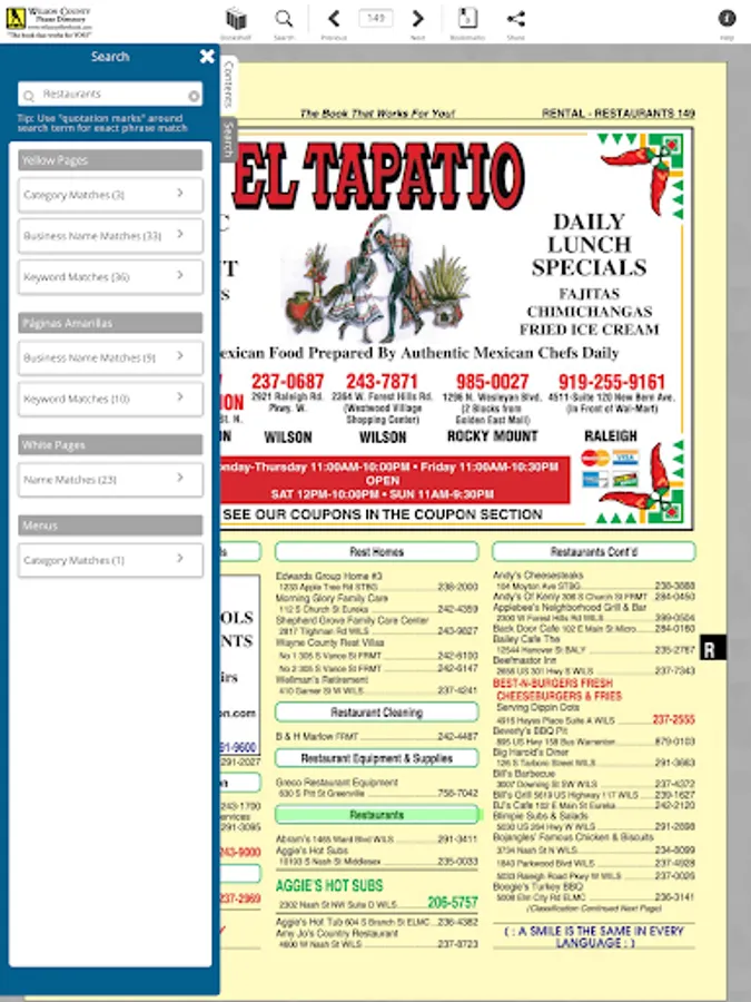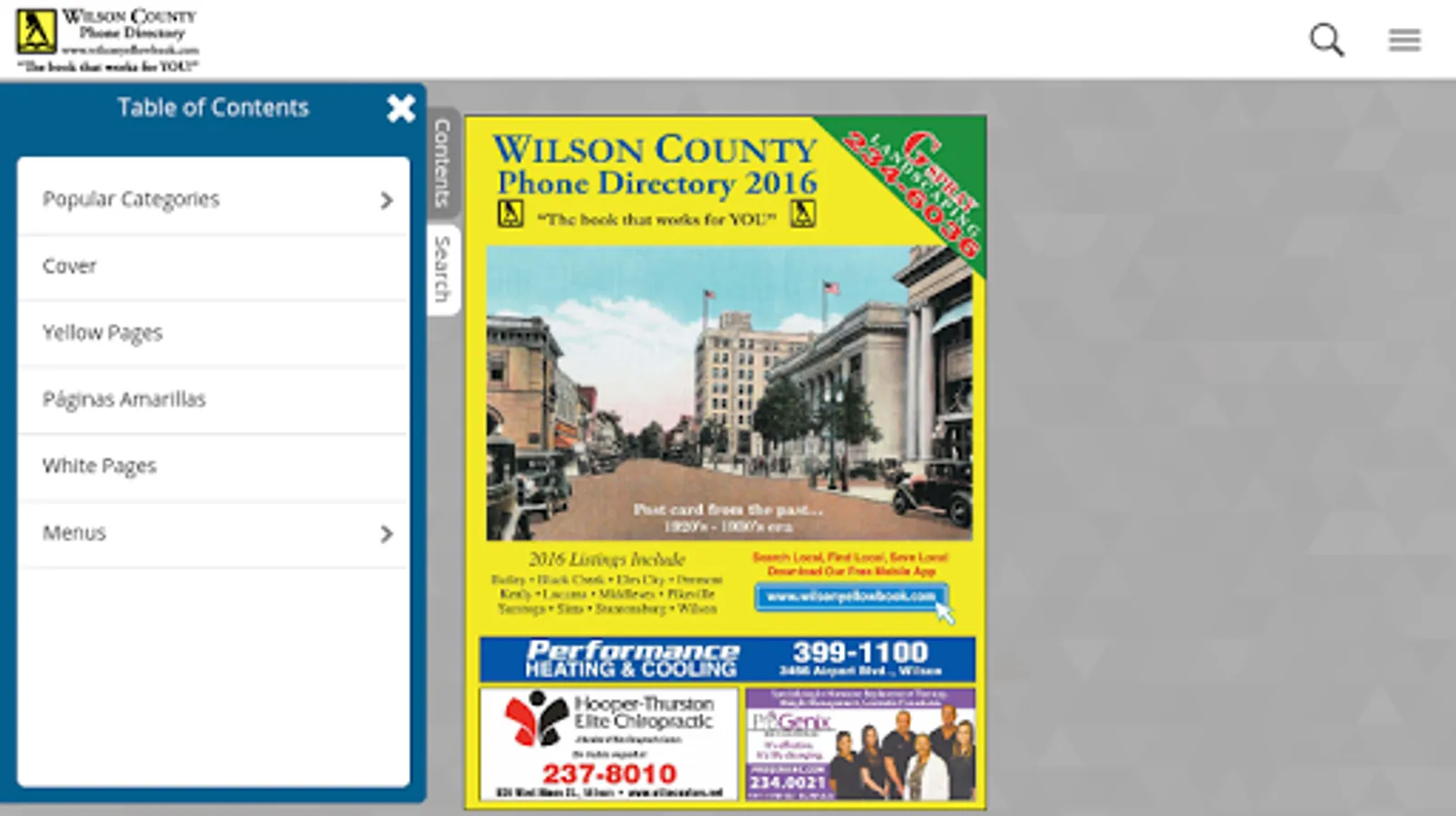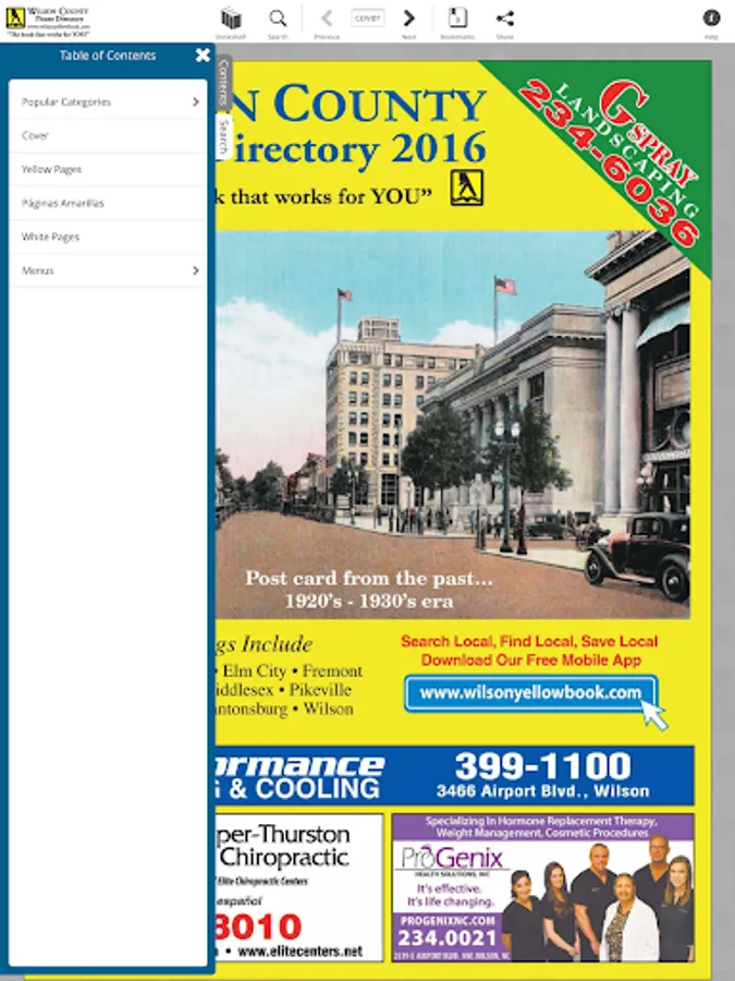 The Wilson County Yellowbook free mobile search app is your source for local services in Wilson County, NC. You can search the entire area for attorneys, plumbers, florists, restaurants and more. Advertisers websites, addresses, and display ads are also instantly available for your shopping needs.
