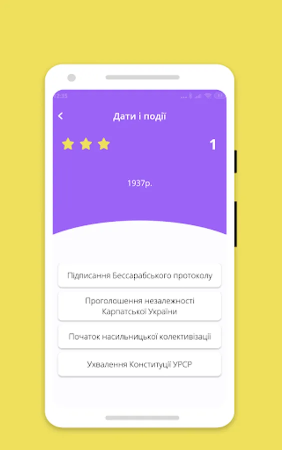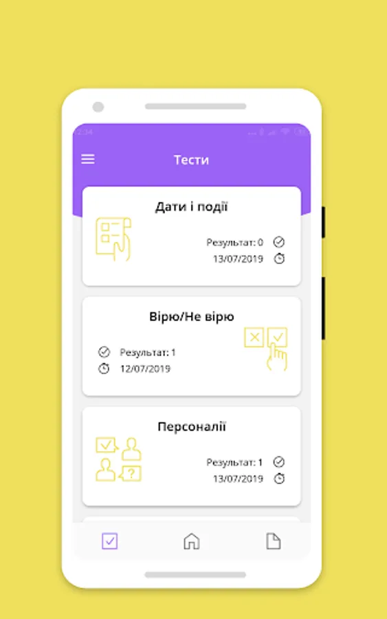 • Non-standard tests. In addition to the familiar date-event matching tests, we offer you to test your knowledge of personalities and landmarks, which other thematic applications like to neglect. Another unique test is "Believe/Don't believe", which is aimed at your accuracy and attentiveness during preparation. It will be necessary to determine the veracity of the presented fact (thesis), which is either real or changed in detail.