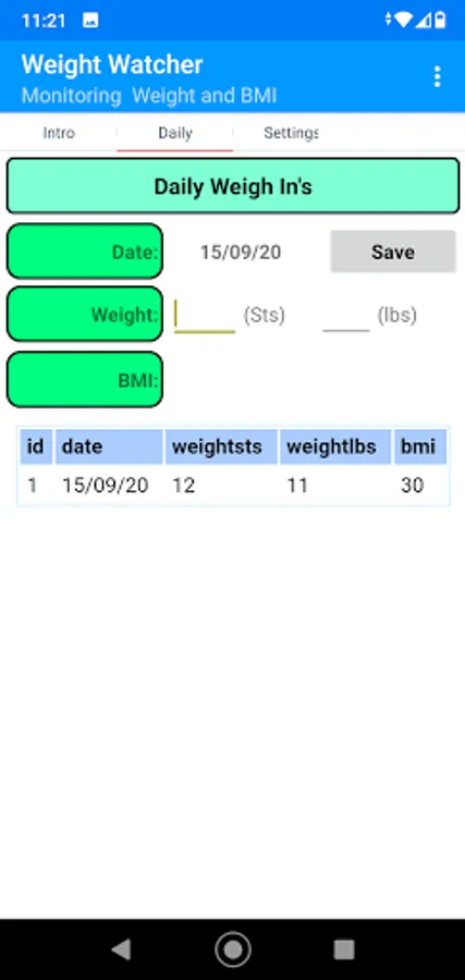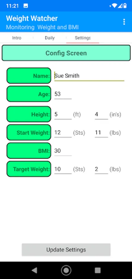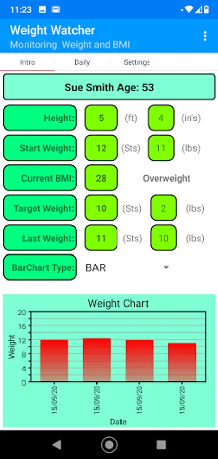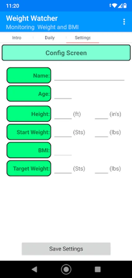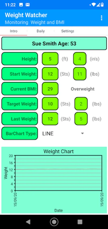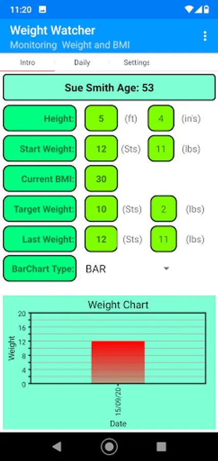 Small app that records Your Starting weight, along with Age, height, and your target weight. The system then shows your details in a graph, calculates your BMI, and informs you of your health status linked to BMI. Simple and cost-free hope it helps.