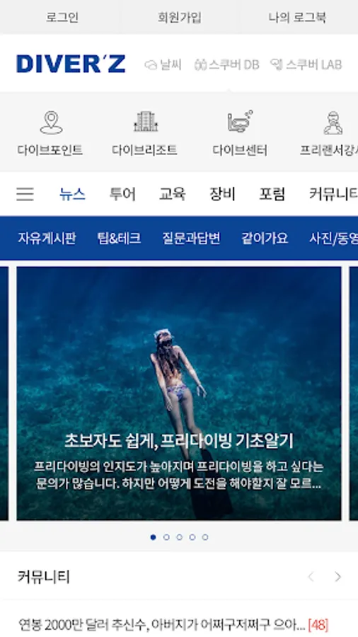 Divers provide the latest news on scuba diving and freediving from all over the world, diving points, resorts, centers, diving pools, freelance instructor information, water temperature, temperature, wave information, diving weather forecast using API, diving equipment reviews, member community, online We provide scuba and freediving portal services such as logbook, expert column, association news, equipment type, education news, and online practice test service.