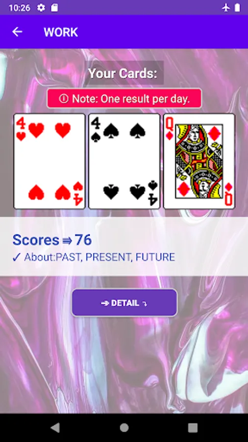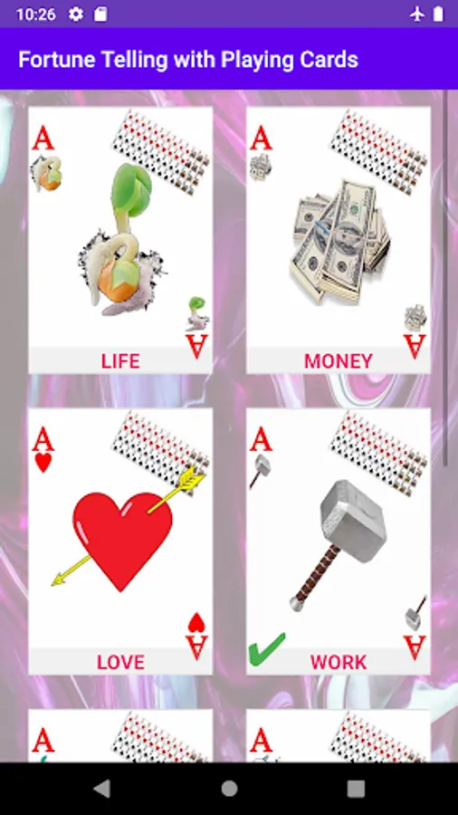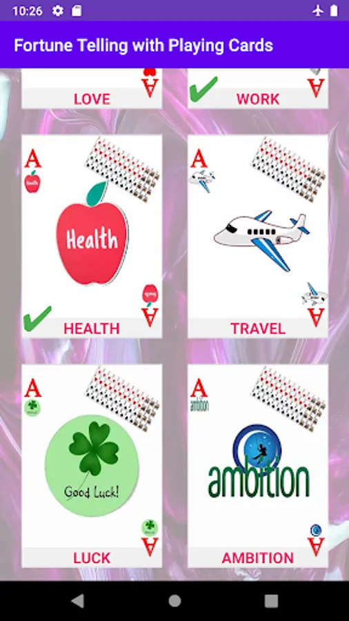 Deck of cards with 52 cards, the combination of cards gives you different results. All you have to do is simply think of a question in one of the following areas of your life and get it answered instantly.