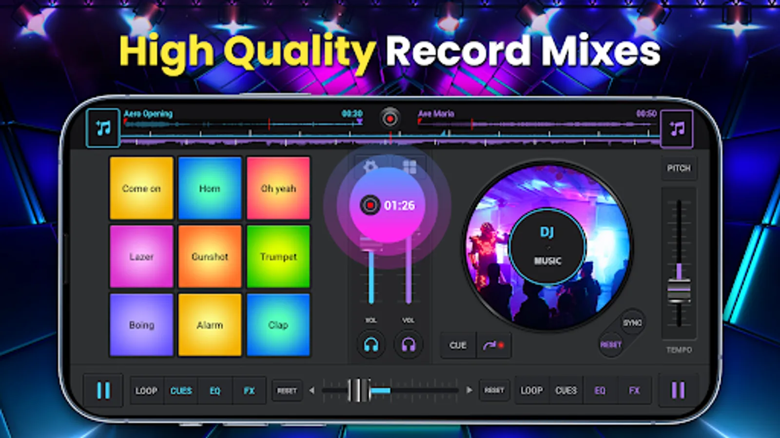 * Large buttons, optimized for small screens, simulate the realistic DJ console