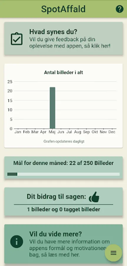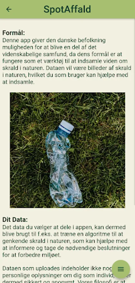 The user can take pictures and upload them via the app's camera or the phone's own camera app in the app's gallery. In addition, the app contains a questionnaire the user can choose to answer. Submitted images can thereby be used in scientific contexts for e.g. to develop robots that collect garbage.