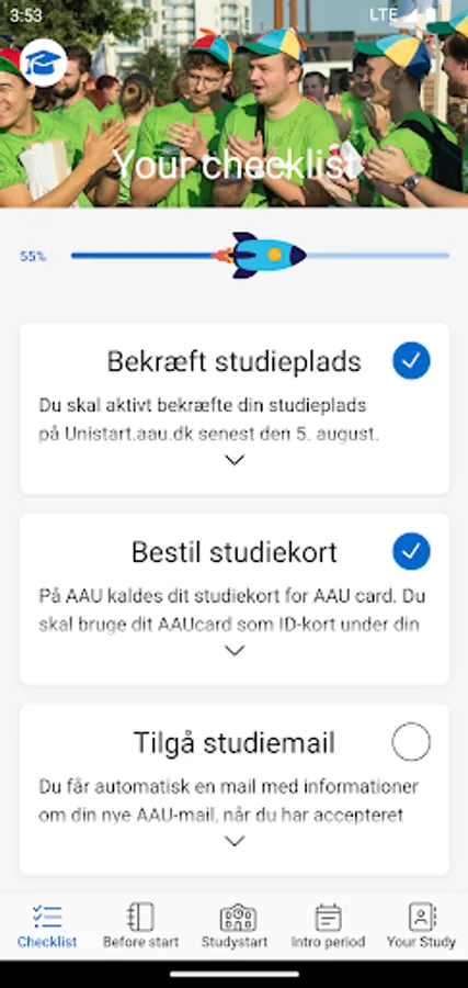 AAU Start is for you who want to start a bachelor's degree at Aalborg University. The app exists to make your study start easier and therefore gathers relevant information about the study start period - you get, among other things, a checklist to get you ready as well as a program for the day you start your studies and the following study start period.