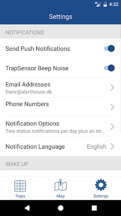 With this app, you can easily set up and configure your TrapSensor units. You can edit which email addresses and phone numbers notifications should be sent to. In addition, you can set a time for daily notification messages. Daily notification messages summarize the status of all of your traps in one message.
