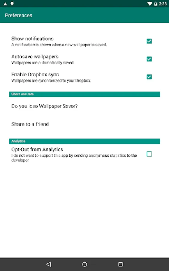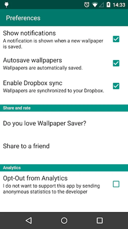 Build in Dropbox support allows you to save and synchronize your wallpapers to dropbox, so you never again have to worry about loosing