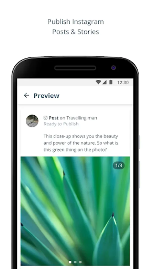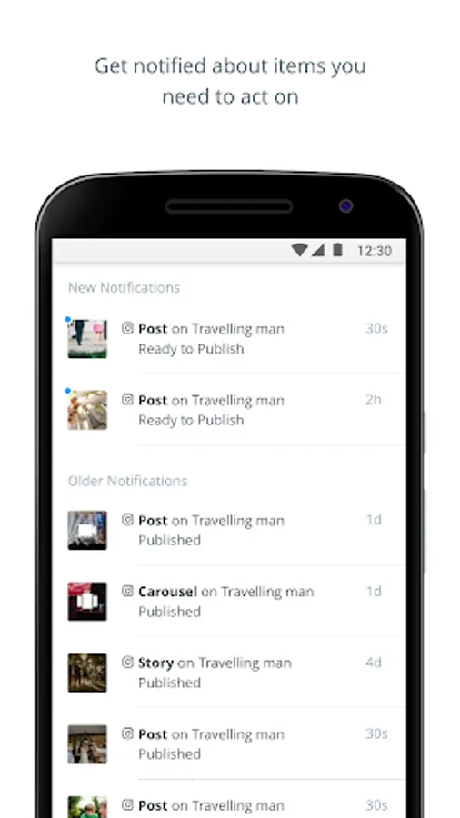 * Publish to Instagram - when your scheduled post is ready to go live, we will deliver the content straight to your phone, so you can publish to Instagram with a single tap