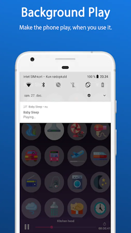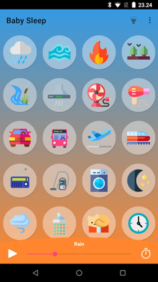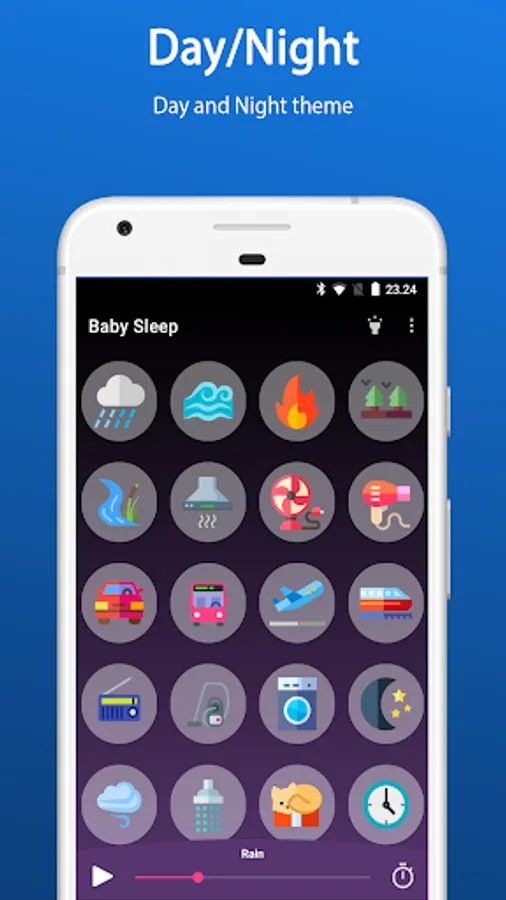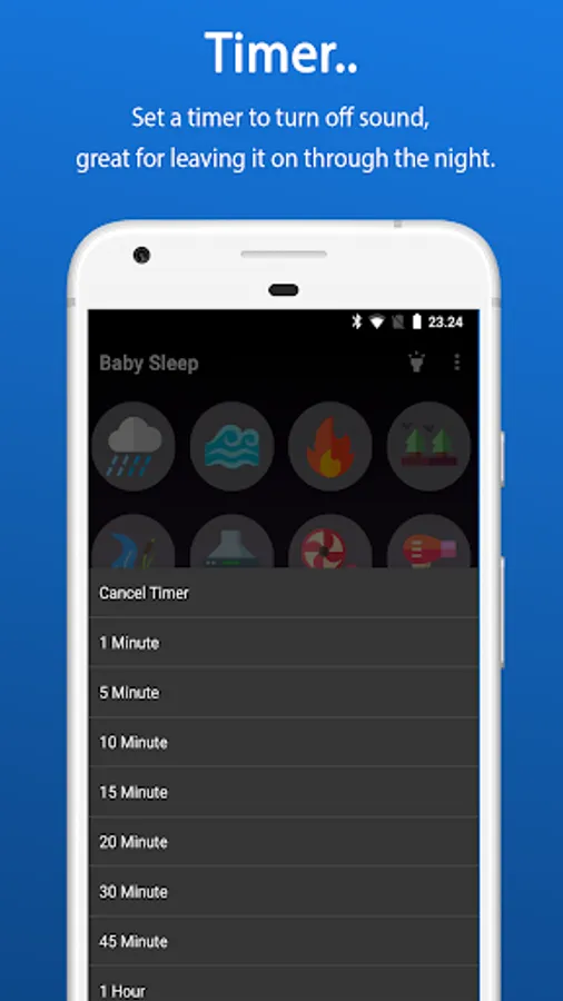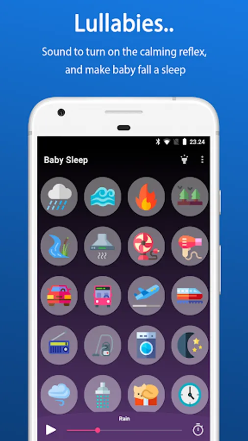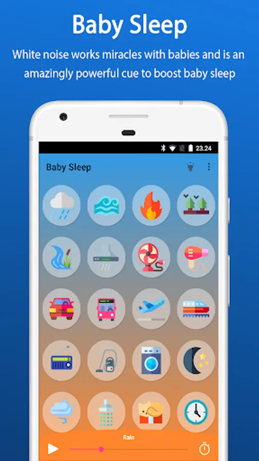 The app contains great selection of soothing white noise and lullabies. It has a simple timer that saves your battery.
