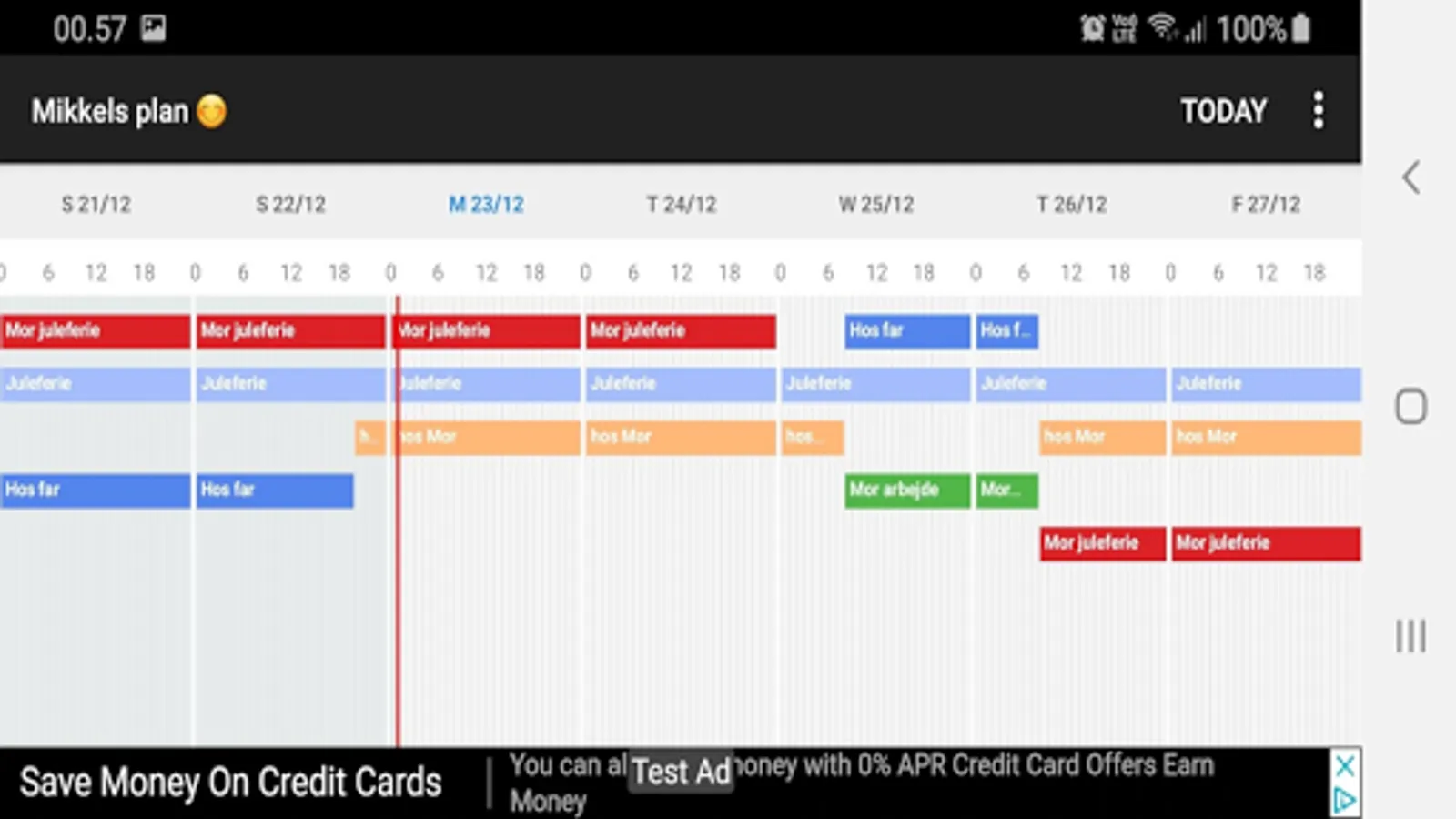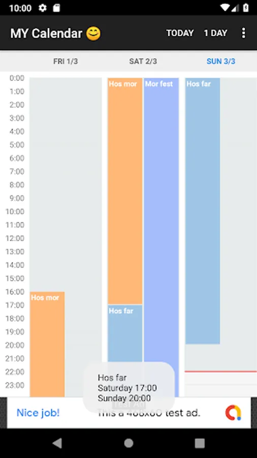 Start view is a 3 day view, where each day takes up one column (possible to zoom in). Full day events are painted from start to finish, to give a more intuitive viewing.