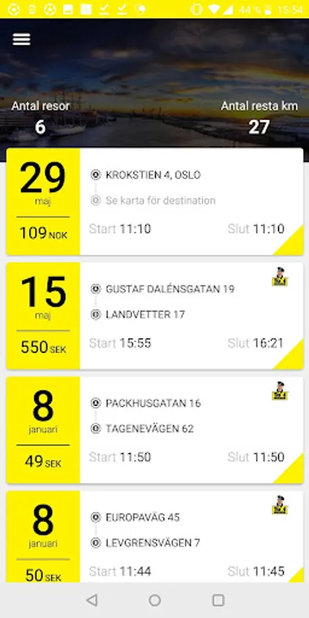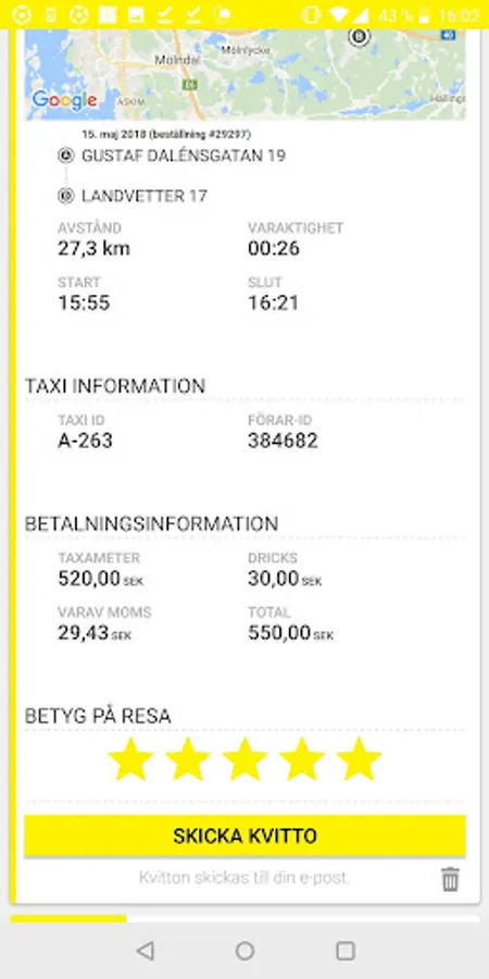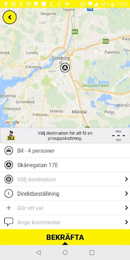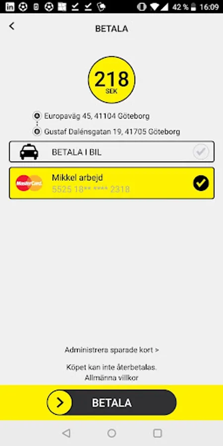 With the account you create in the app, you can see completed trips and register credit cards for easy payment. To be able to provide the best possible service, extra services are booked (car seat, pet, large car) by phone +46 (0) 31-650 000. You can cancel any changes in the app no later than 20 minutes before departure.