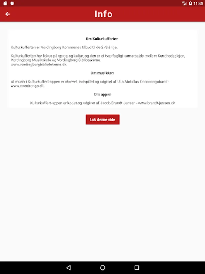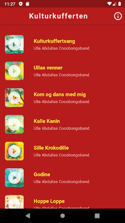 This app contains the songs that are part of the Vordingborg Libraries' children's cultural project Kulturkufferten. All tunes are composed and recorded by Ulla Abdulla's Cocobongo Band.