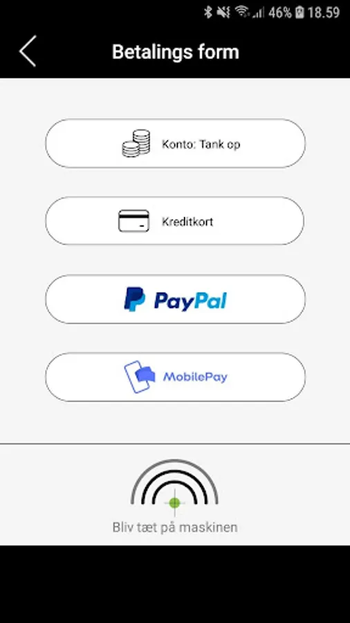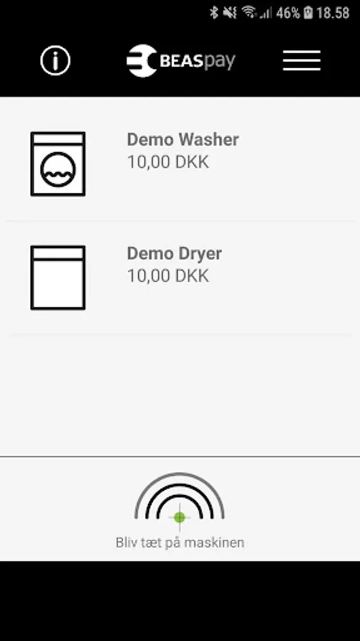 The BEASpay App is easy to use. When you open the app, it scans for machines which have BEASpay integrated. Is there a machine nearby, it is displayed on the phone, the machine is selected and payment can be carried out. The payment is made in the app when typing in credit card data, using PayPal, etc. As soon as the payment is completed, the machine will be notified, and the requested service is available. Remember to close the BEASpay app before the machine has registered the payment.