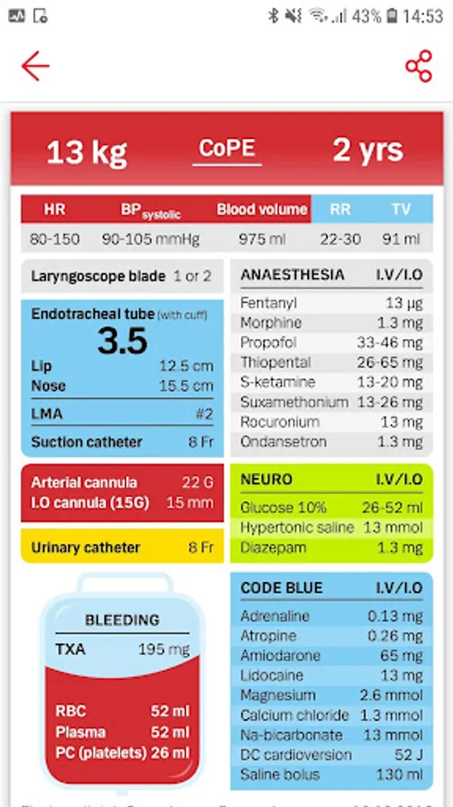 CoPE App consists of 31 guide sheets, corresponding to one guide sheet per kilogram bodyweight, ranging from newborn (3 kg) until 10 years of age (33 kg).