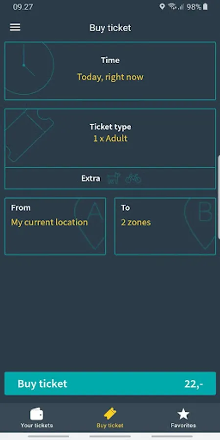 Enter your basis-information and get easy access to repurchasing tickets. You can also save your favourite destinations i.e. home, work or school, so you have quick access to buying a ticket from where you are travelling from, to where you are travelling to.