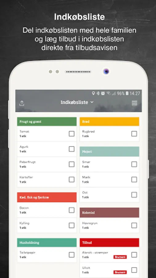 When you open an offer newspaper in the app, you simply tap on the offers you want to buy. The offers are then created in the shopping list, so you can use this as your to-do list when you shop in the store. It's also easy to add to the shopping list other products you want to buy. Simply press the + symbol. You can also orally dictate items you want to appear on the list. Use the shopping list in the store and remove items from the list as you find them in the store.