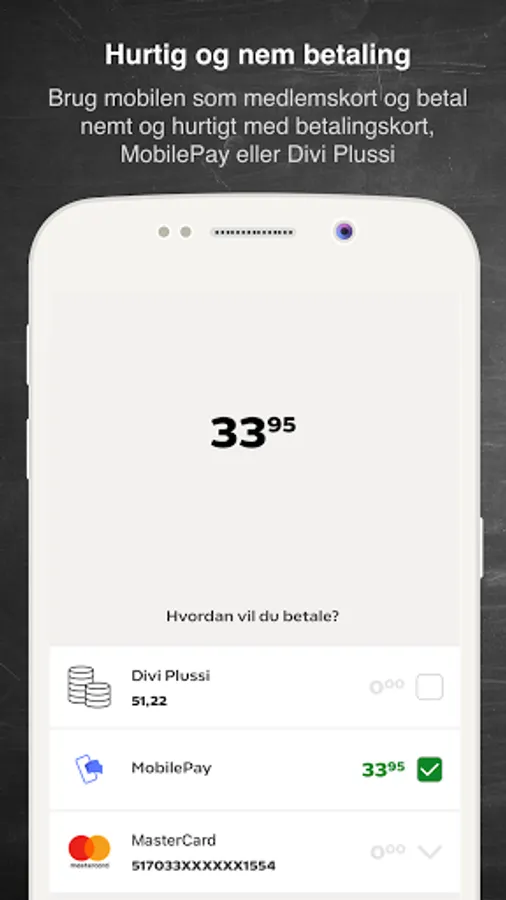 Although your regular membership card still works as before, you can easily and quickly use the app as a digital membership card at checkout. Scan the app via bluetooth or a QR scanner at checkout, and also pay easily with your saved Divi Plussi, MobilePay or an associated payment card.