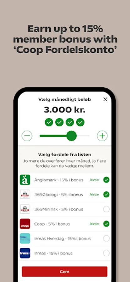 Sign up for a ’FordelsKonto’ and get up to 15% i bonus on the Coop brands you buy every week!