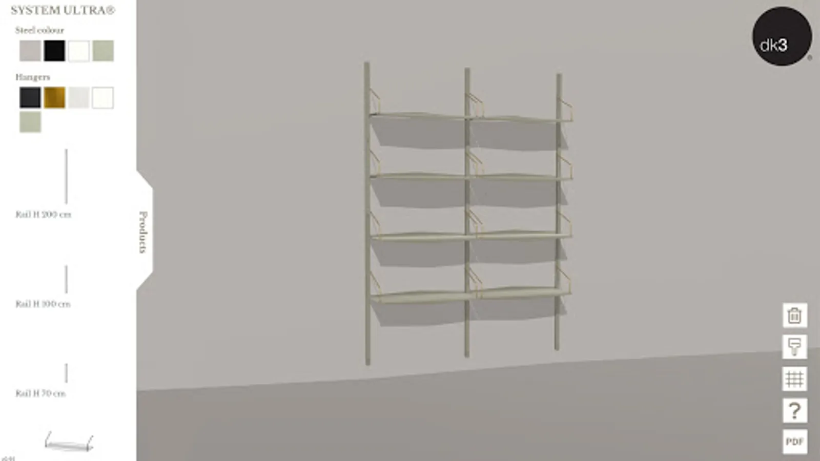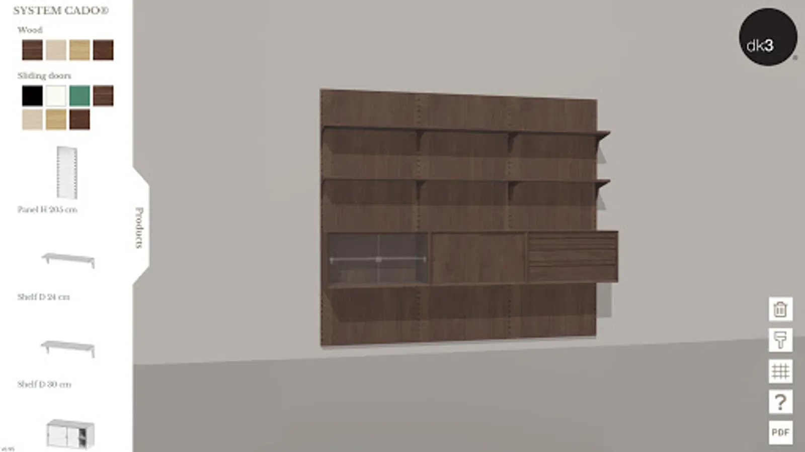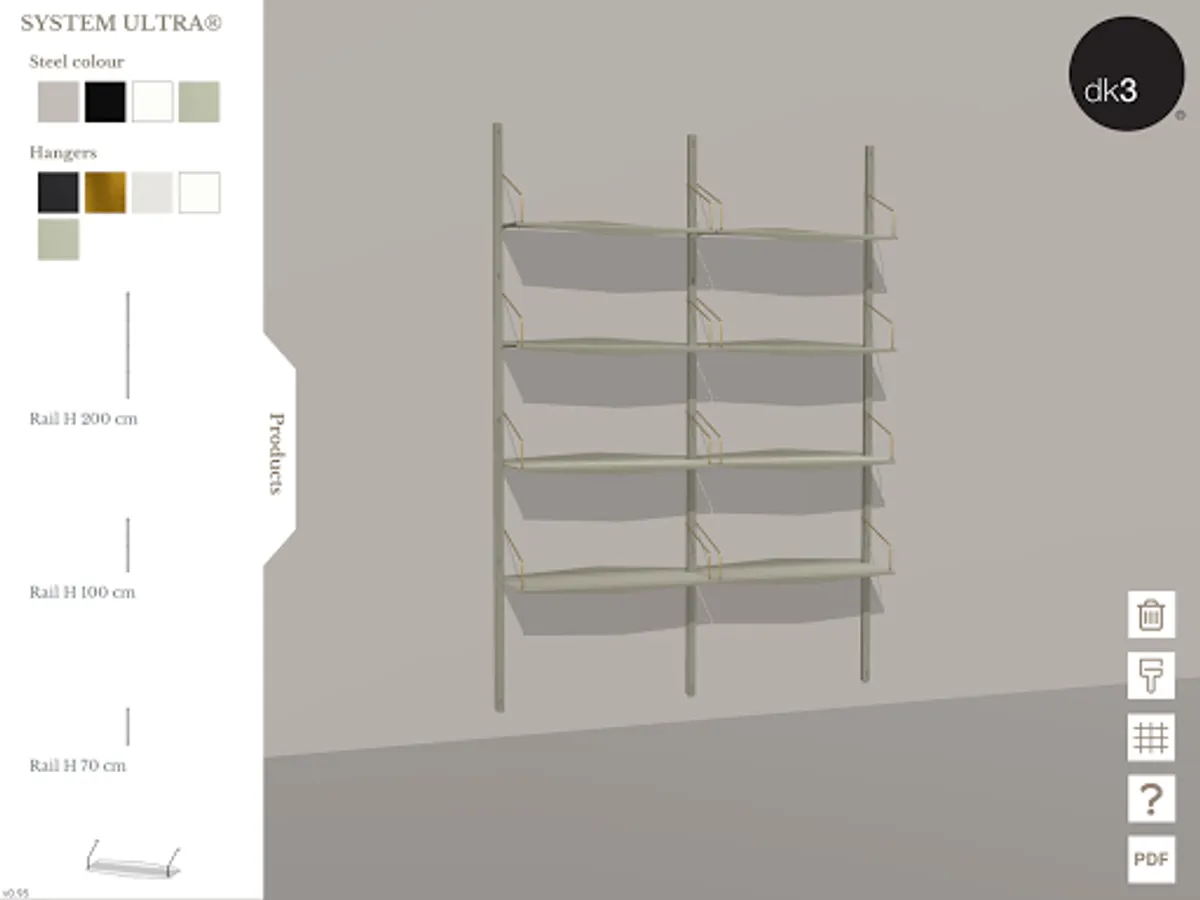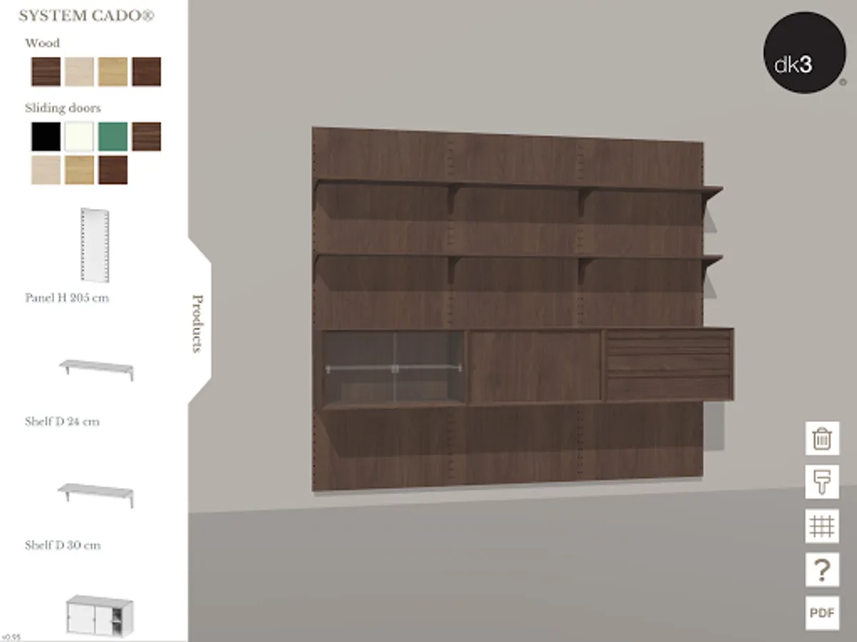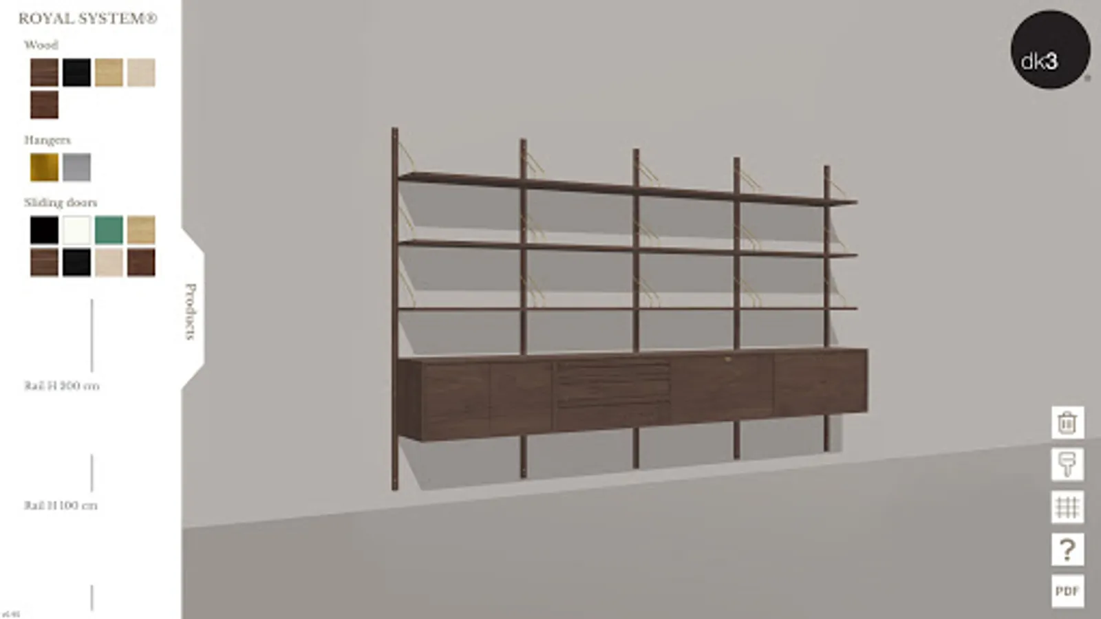 With the dk3 configurator you can create your own combinations of the shelving systems ROYAL SYSTEM®, SYSTEM ULTRA® and SYSTEM CADO®, designed by the famous Danish furniture designer Poul Cadovius back in 1948, 1957 and 1960, and relaunched by dk3 in the period between 2010 and 2019.