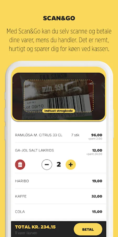 Scan your items with your phone and pack them instantly into your shopping bag while you shop. You pay with a single swipe in the app and can leave the store without queuing at the checkout. It's easy and you save time.