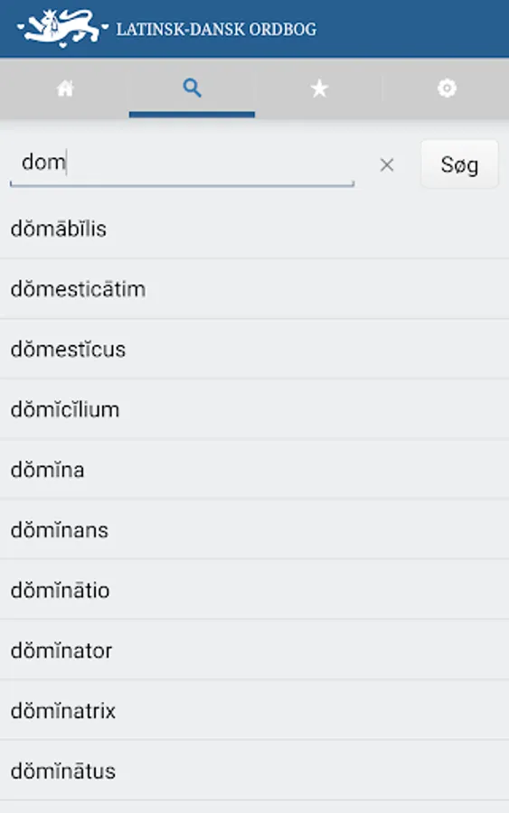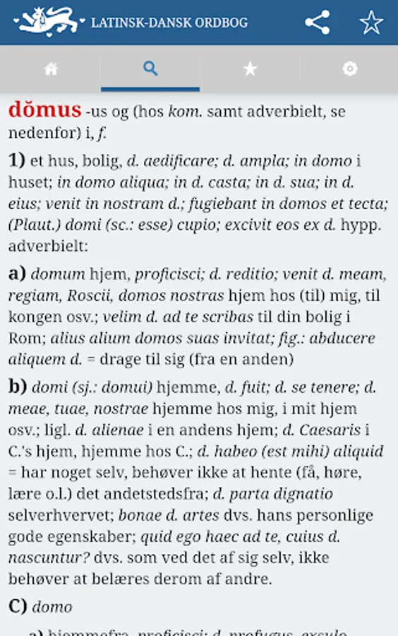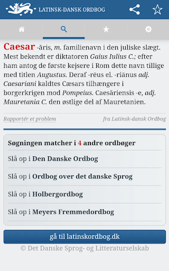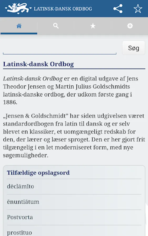"Since the publication and until now," Jensen & Goldschmidt "has been the standard dictionary from Latin to Danish, an indispensable tool for those who learn and read the language. It is here made freely available in a slightly modernized form, with new search options, including search for bending forms.