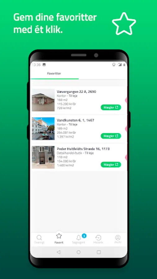 No matter where you are, the Ejendomstorvet app lets you easily and quickly get a glimpse of featured items across the country from our 200+ real estate agents and property owners behind the portal. With the Ejendomstorvets app you get the largest selection of commercial premises and investment properties in one place.