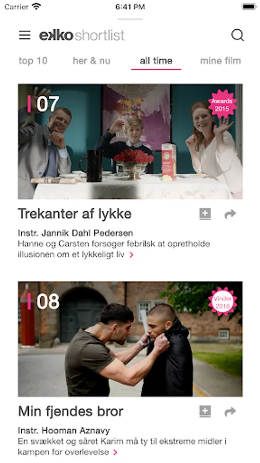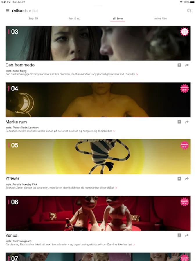 Watch the latest movies on the Top 10, follow the live-updated Here & Now and explore All Time with over 1,000 movies. With just a few clicks, you can easily contribute to the competition by giving the movies stars and sharing your favorites with friends on social media.