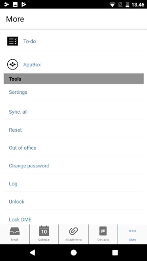 - Remote wipe of all DME data, all files on SD card, contacts, call logs, SMS messages.