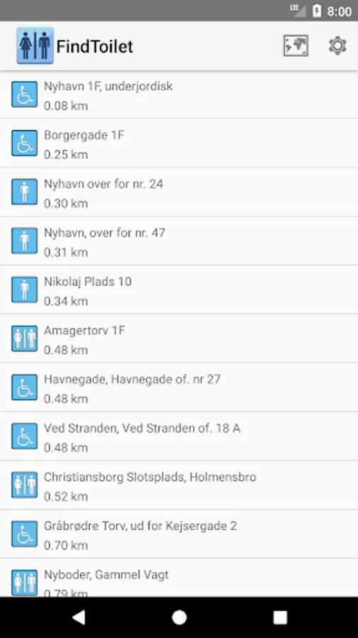 - Overview of public toilets on a map or on a list with the nearest toilet at the top.