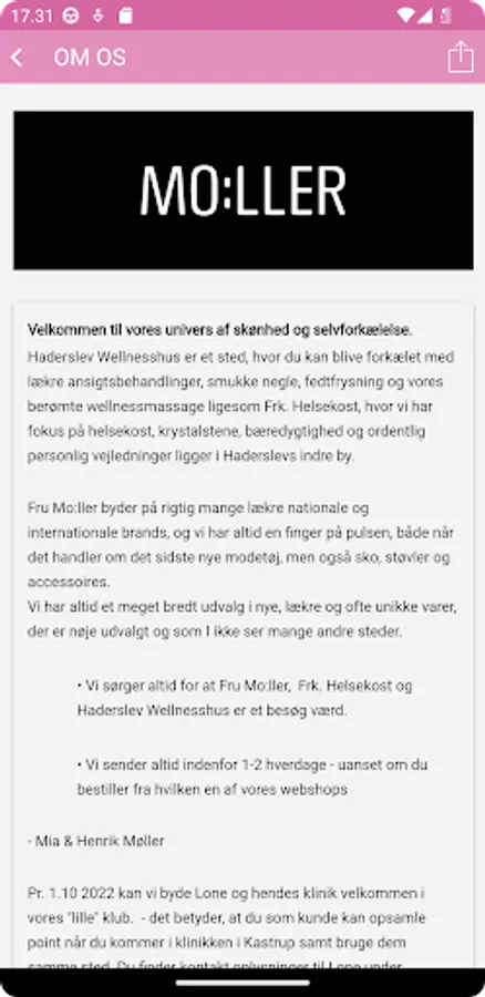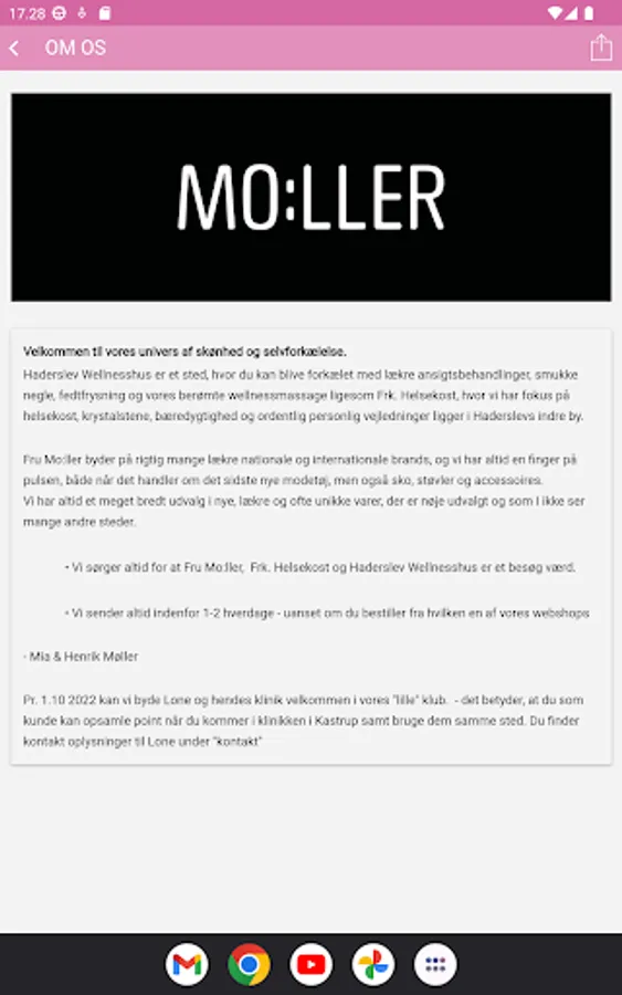 The clothing stores Fru Mo:ller are located in the heart of Haderslev's pedestrian street and on Hestedamsgade in Horsens and are both part of both Haderslev Wellnesshus where beauty is our trademark. A place where you can be pampered with delicious facial treatments, beautiful nails, fat freezing and our famous wellness massage just like Ms. Helsekost, where we focus on health food, crystal stones, sustainability and proper personal guidance, is located in Haderslev's inner city.