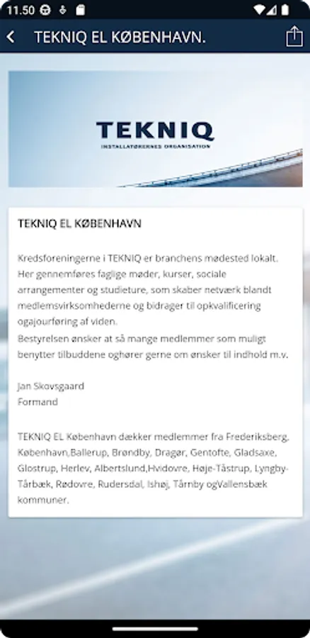 TEKNIQ EL Copenhagen covers members from Frederiksberg, Copenhagen, Ballerup, Brøndby, Dragør, Gentofte, Gladsaxe, Glostrup, Herlev, Albertslund, Hvidovre, Høje-Tåstrup, Lyngby-Tårbæk, Rødovre, Rudersdal, Ishøj, Tårnby and Vallensbæk municipalities.