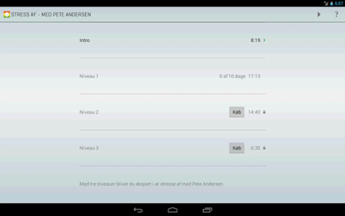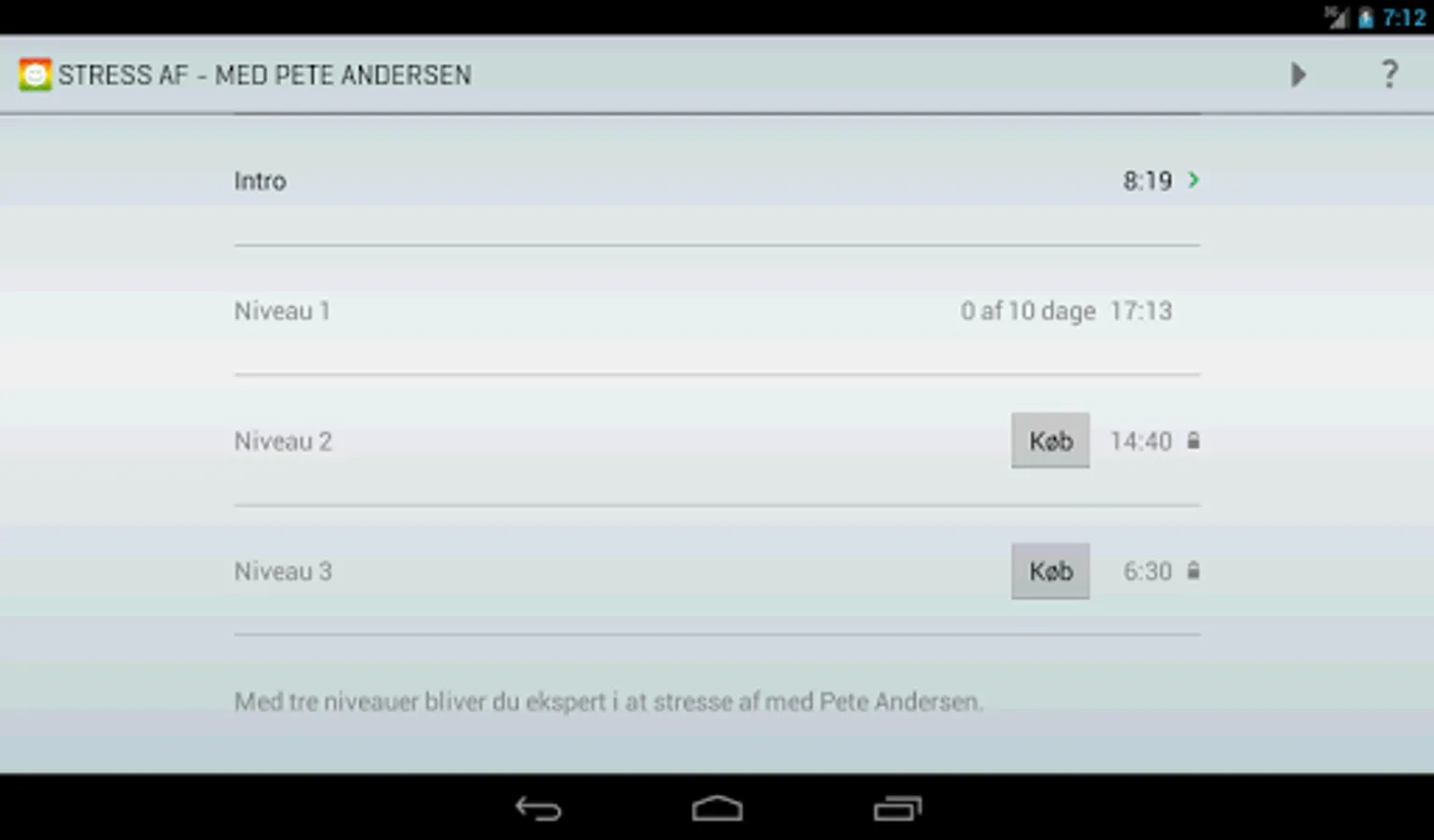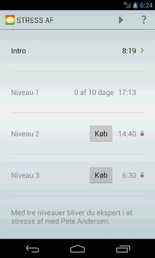The biggest benefit you get by performing the exercise on each of the 3 steps for 10 days straight. The app therefore contains a counter that keeps track of how many days you have listened to each step. If you hear this exercise several times on the same day, it counts only as one day. If you pause a day, then count it a day down again when listening ideally happen every day that you get the most out of the app. When the level reaches 10, the counter starts at the next level. Only when all three counters reaches 10, the app counting days. At that point you are qualified as 'relaxes'.