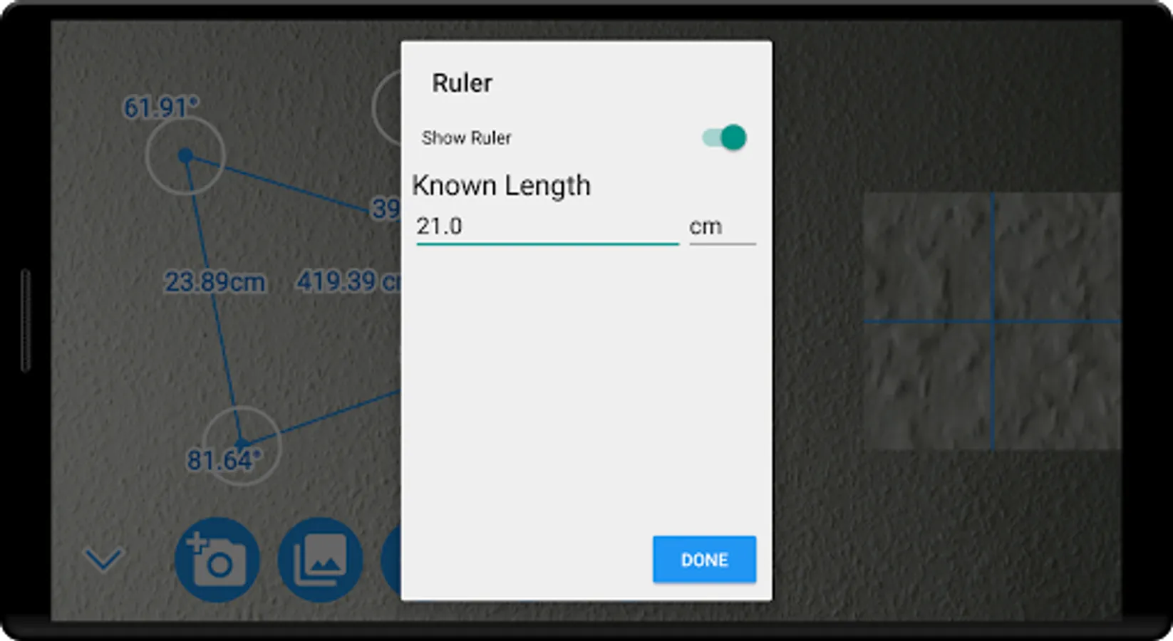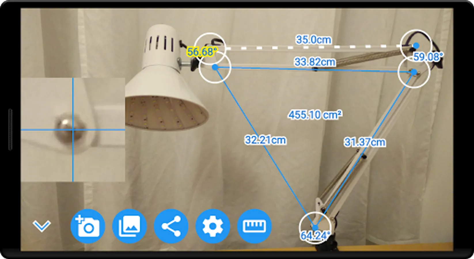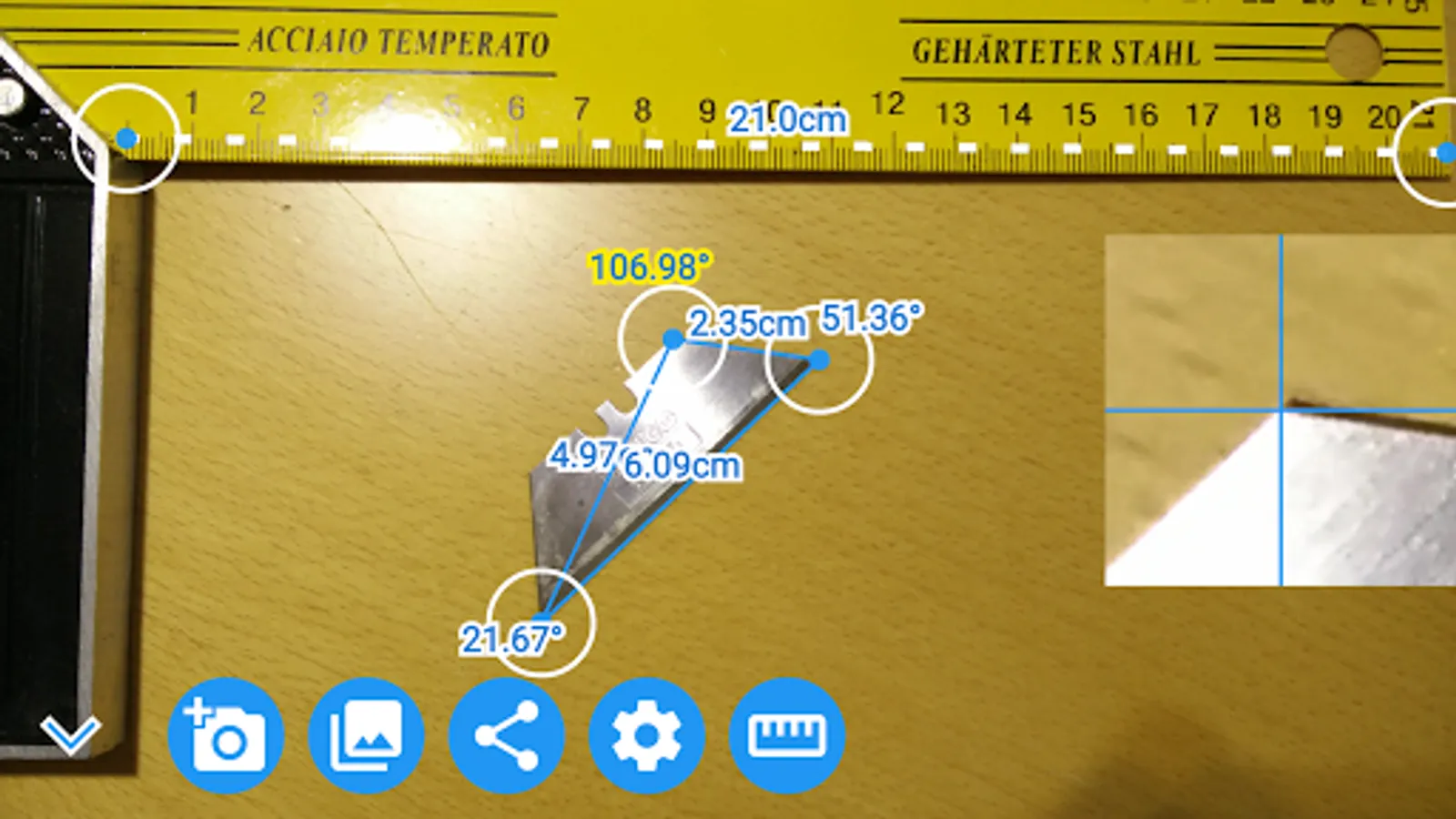 This smart protractor let you take a picture with camera or from gallery, and then with the triangle, measure angles and lengths relative to the reference line.