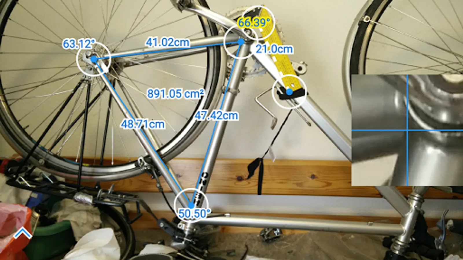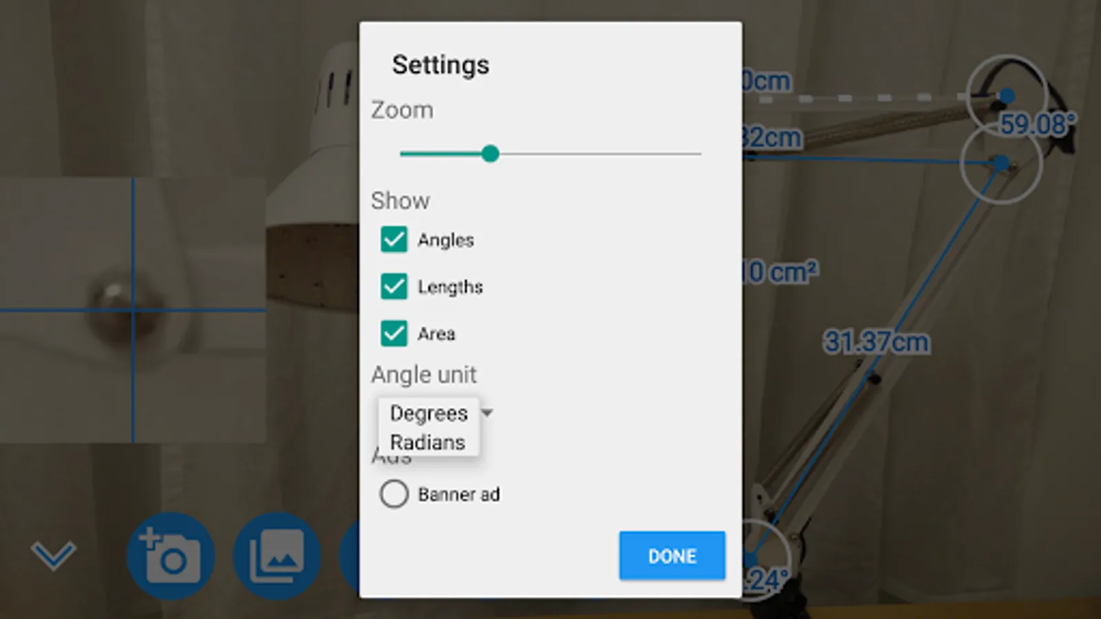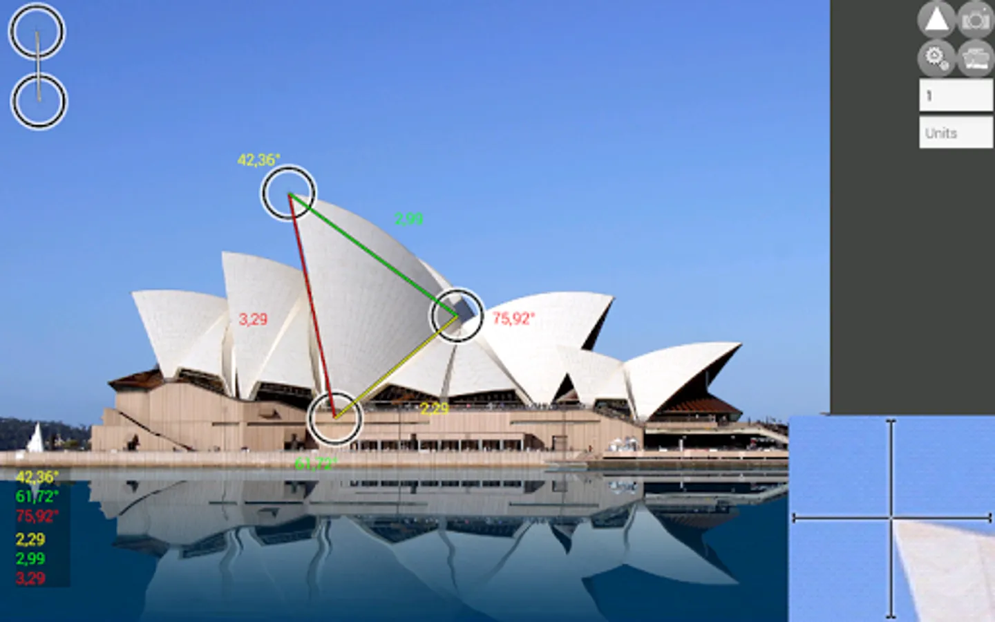 This smart protractor let you take a picture with camera or from gallery, and then with the triangle, measure angles and lengths relative to the reference line.