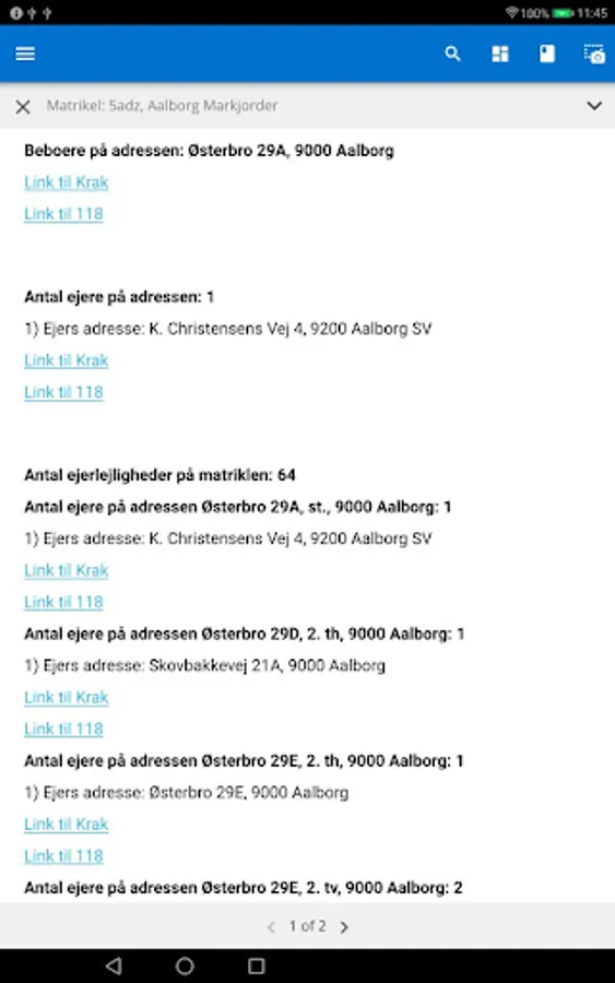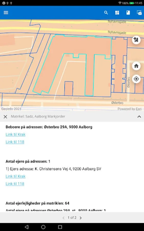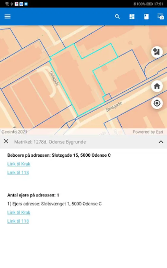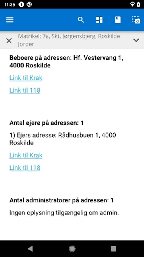 Click on property or plot of land: It may be necessary to zoom in and pan until you have the right property or plot of land. Click to select the desired area. Now the address of the owner, residents and administrator is displayed, and below is a link to Krak.dk and 118.dk, with owners, residents and administrator.