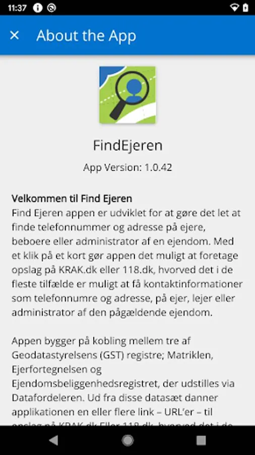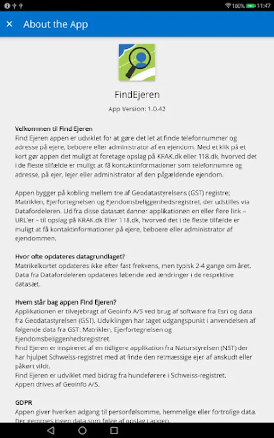 Data update: GeoInfo updates the cadastral map for the app 2-4 times a year. Other data from the Data Distributor is continuously updated in connection with. the authorities' updating of the respective data sets.