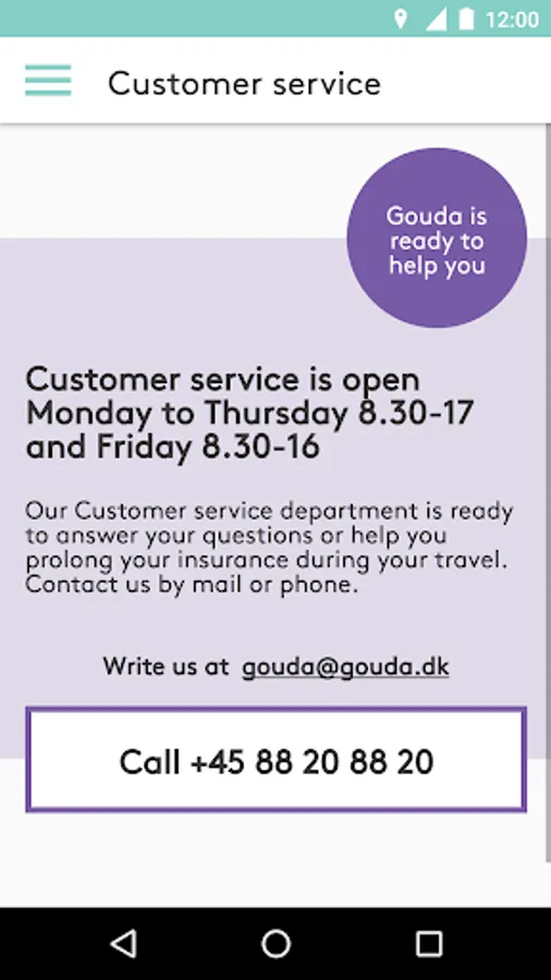 No matter where in the world you are, help is always close at hand with Gouda’s app. The app provides you with your insurance card with all your policy details right at your fingertips, and with a single touch you can call Gouda’s Alarm Centre ready to help you 24 hours a day, should you need any assistance.