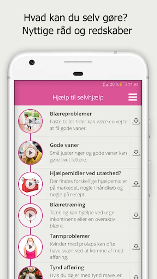 The purpose of this app is to give you the knowledge and tools to prevent and relieve pelvic floor problems, and not least to seek the right treatment if you need it.