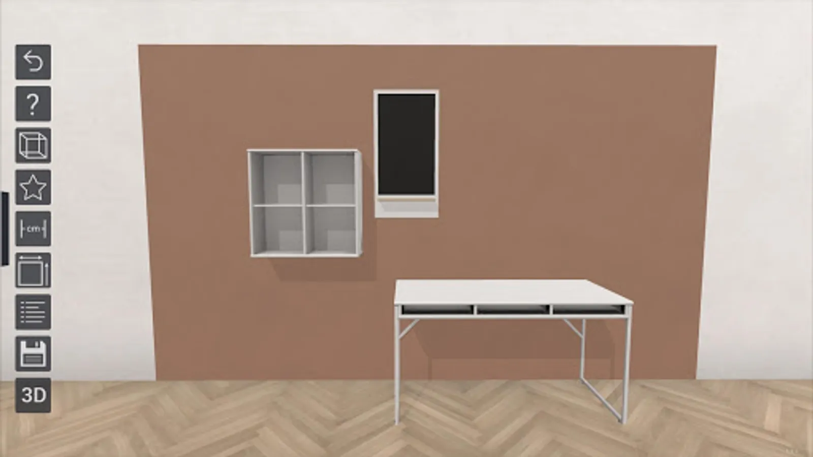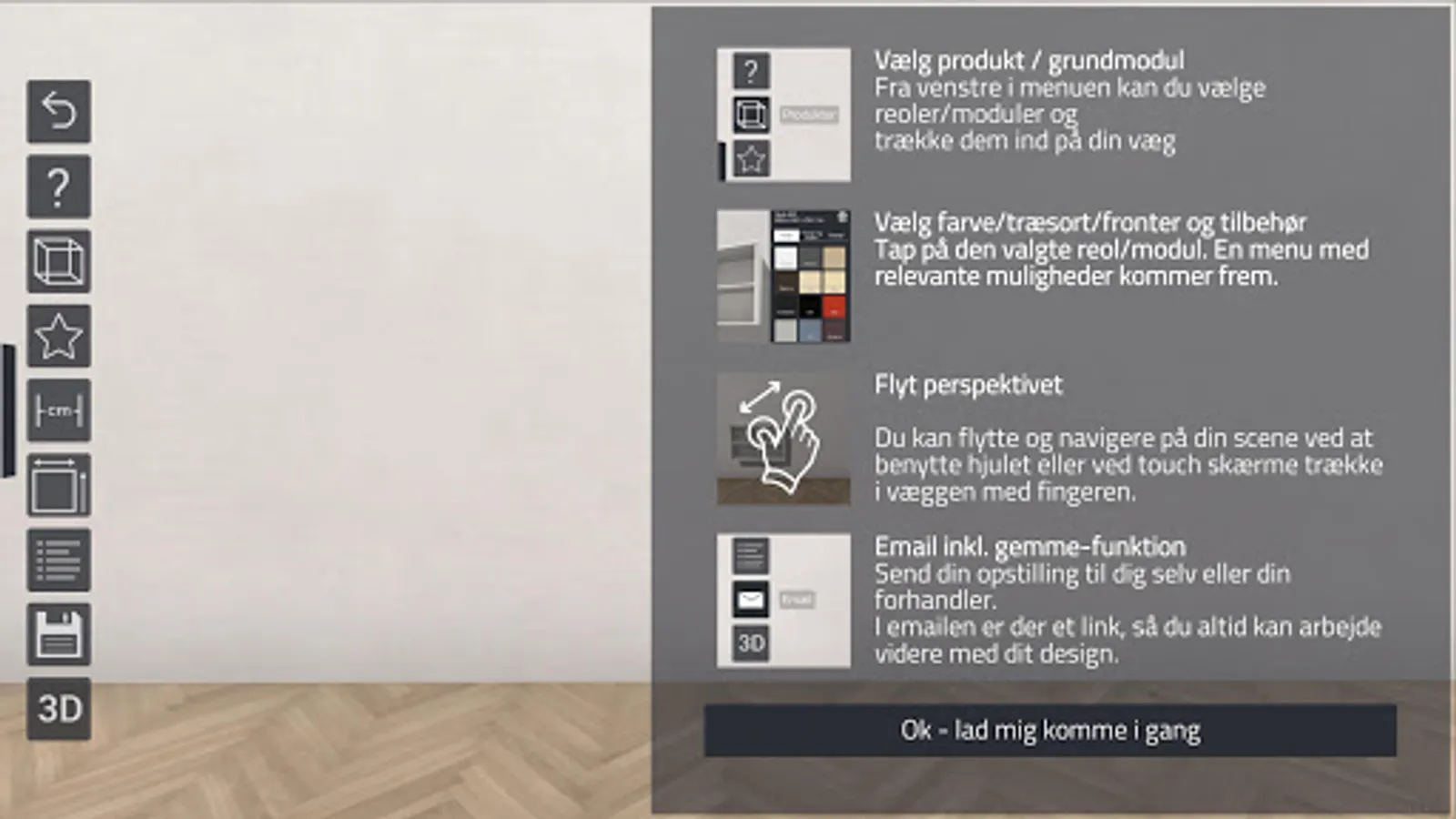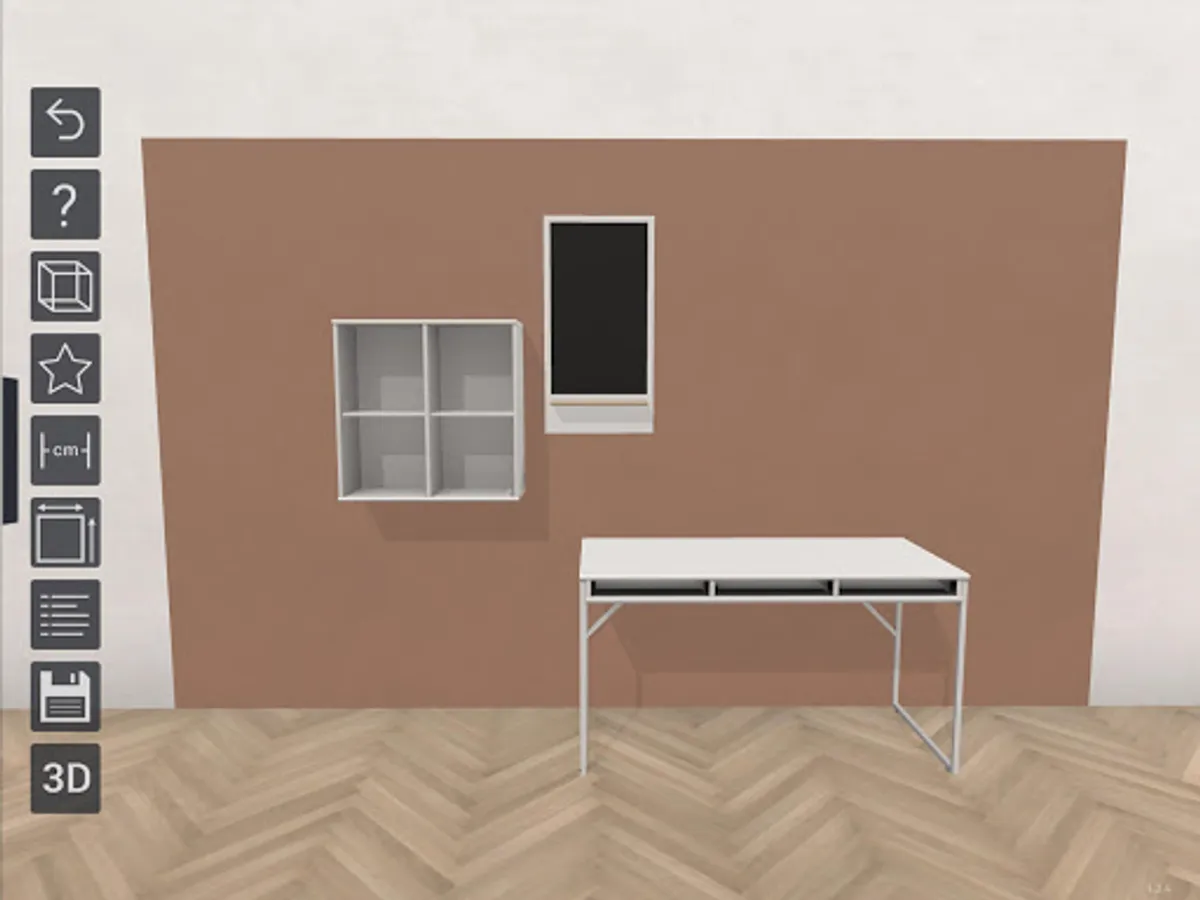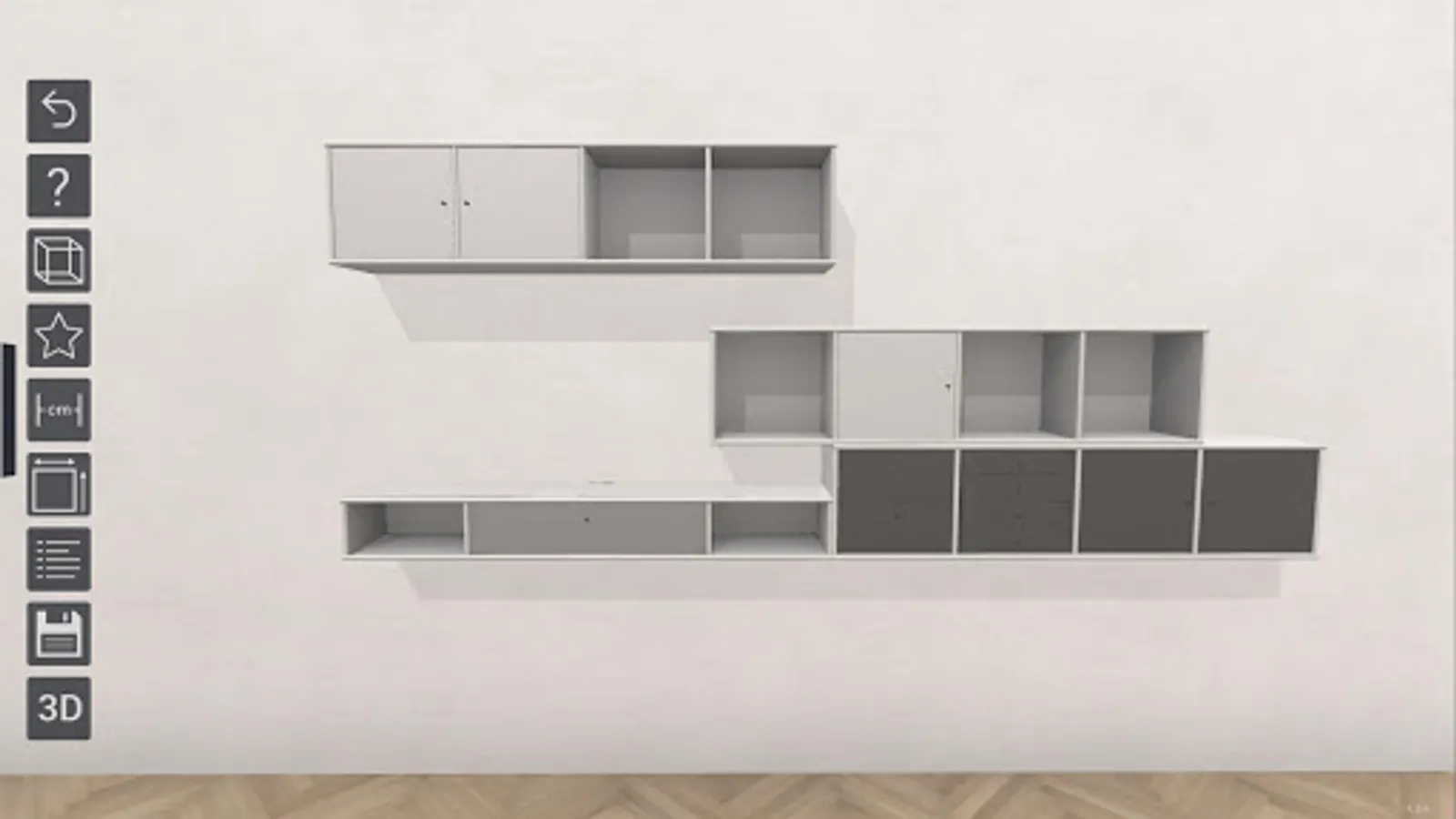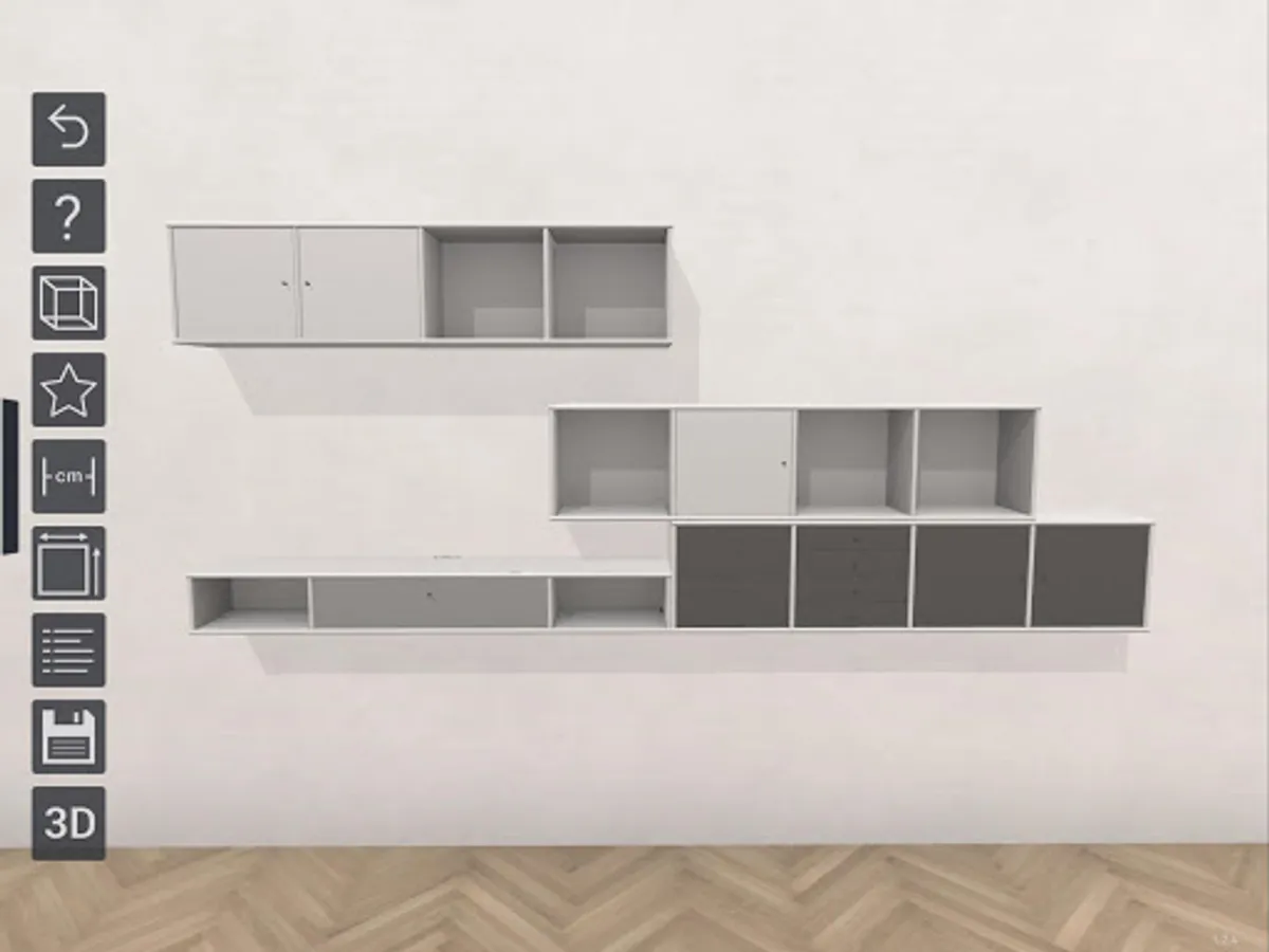 When you have the downloaded the App, and printed / picked-up the fields, you place the A3 fields to your wall where you want the product. Choose between the three ranges and the different colors and the sideboard / shelving unit are placeras to your wall in real size and in 3D.