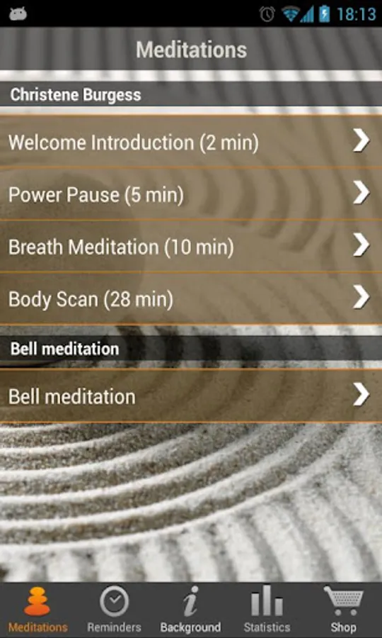 Besides an introduction to mindfulness and how to practice it, the app contains 3 guided meditations by Christene Burgess: