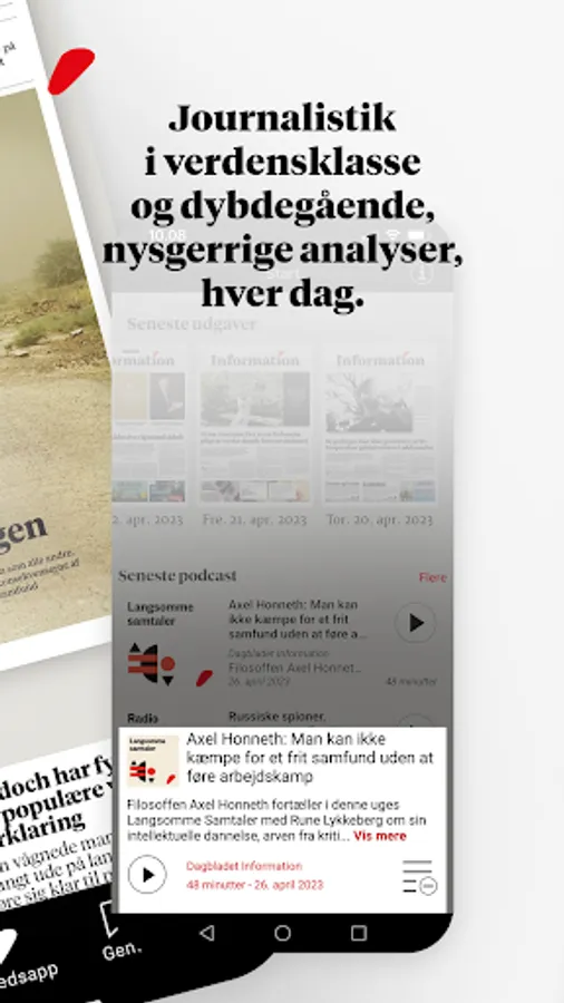 Use of the e-newspaper requires a subscription to Information. As a subscriber, you also have access to Information's other app, which is not based on the printed version of the newspaper as here, but is updated continuously and presents the newspaper's articles, photos and audio in a clean digital design.