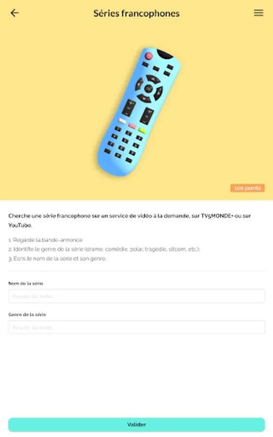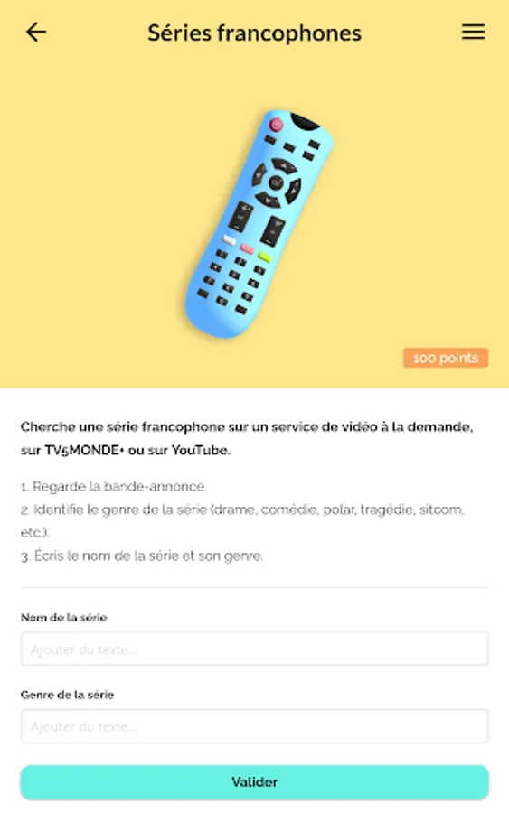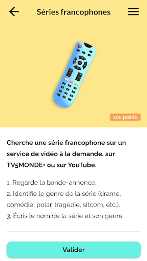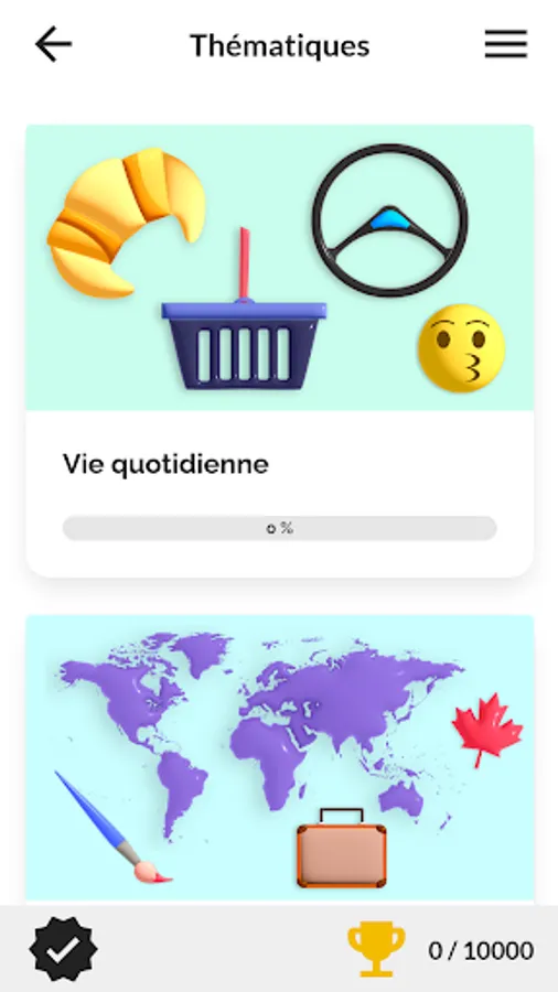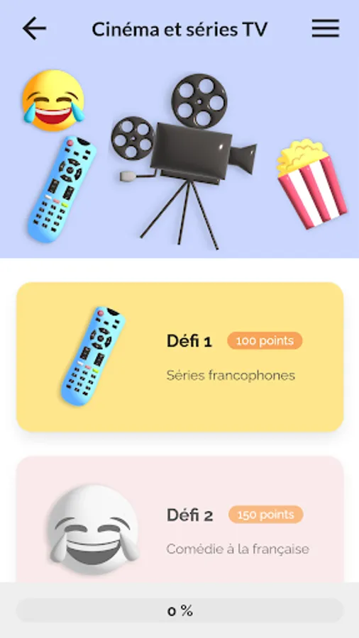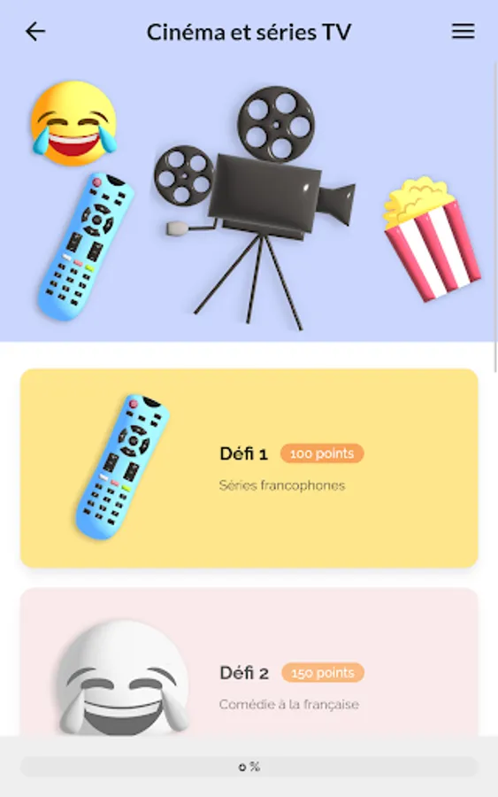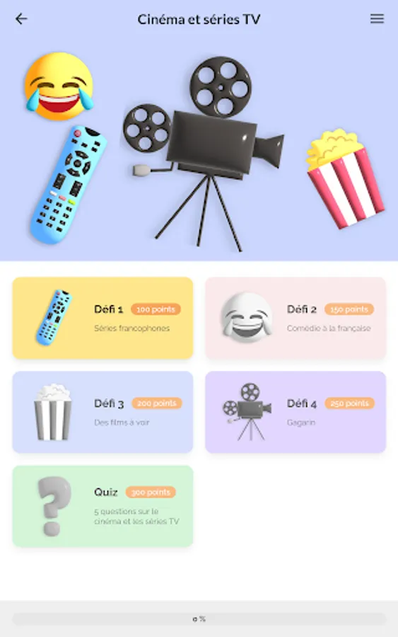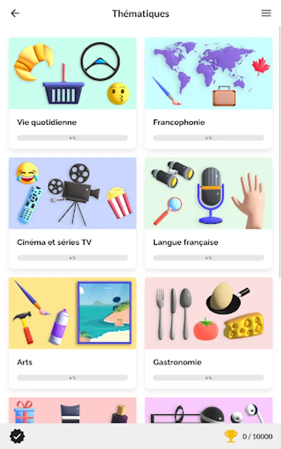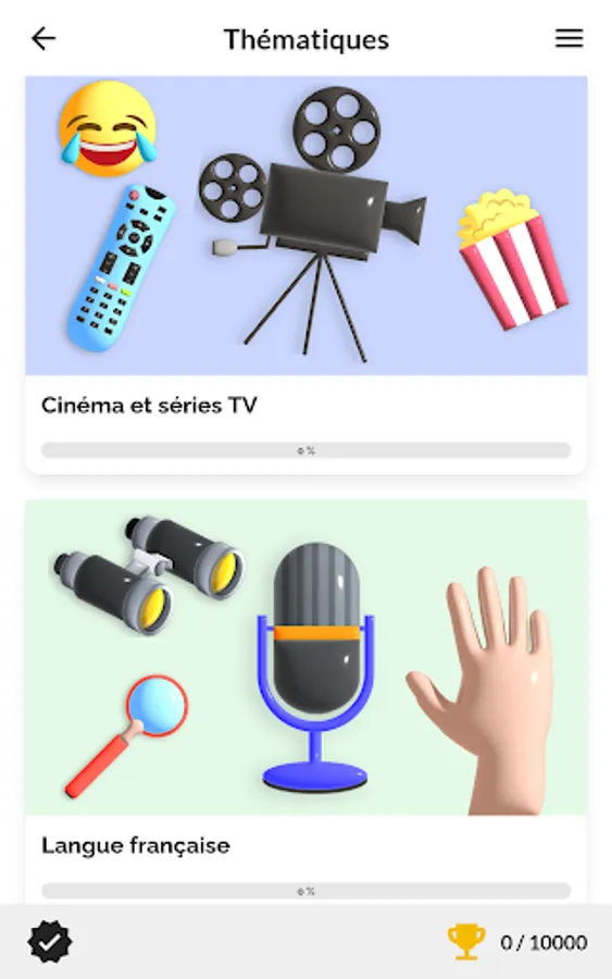 The application includes 10 themes (arts, comics and literature, cinema and TV series, Francophony, gastronomy, French language, fashion and luxury, music, sports and daily life) each consisting of 4 challenges and 1 quiz.