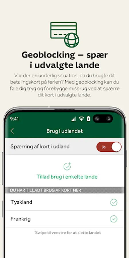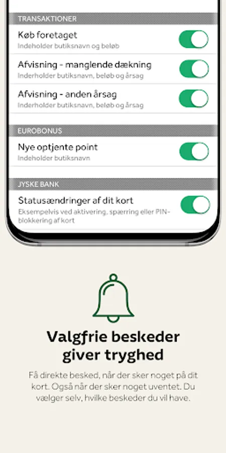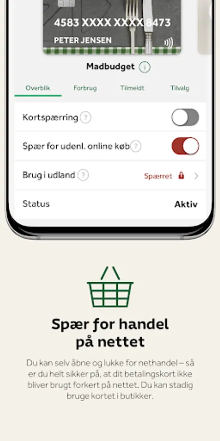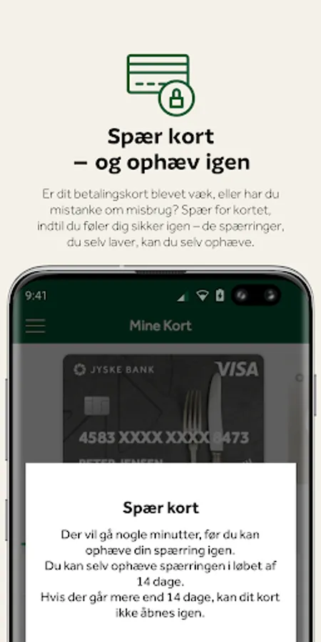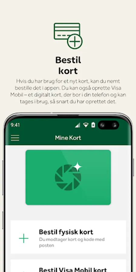 Mine Kort gør det nemt og hurtigt for dig selv at styre dine kort. Du kan både bestille, aktivere og spærre kort, og du får nye muligheder for at øge sikkerheden og bevare overblikket.