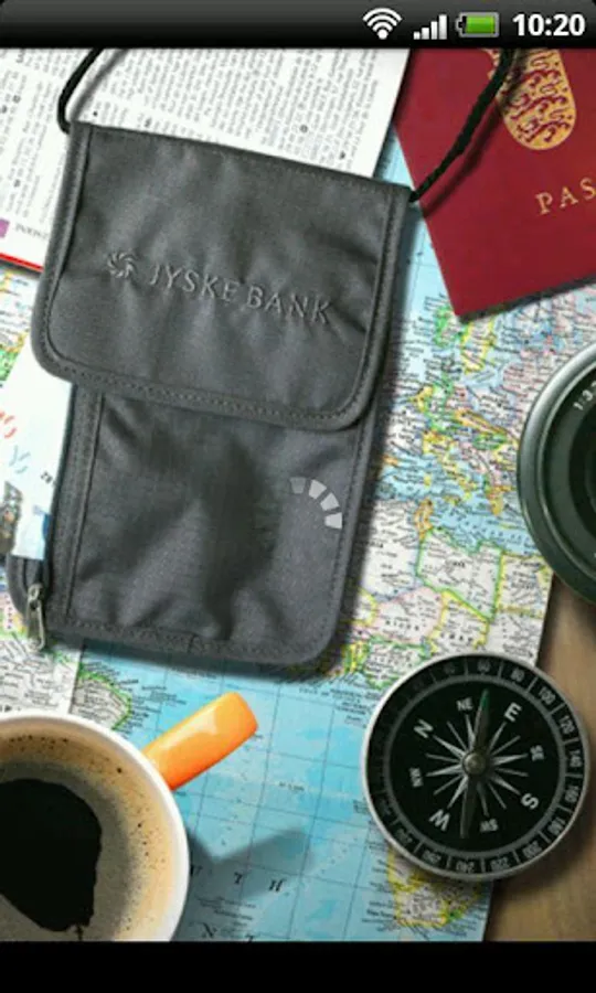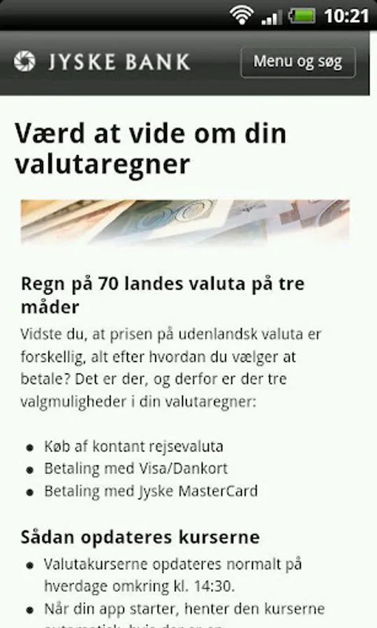 Jyske Bank Mobile can be downloaded for free. With mobile banking, you can also order travel currency if you are a client of Jyske Bank.