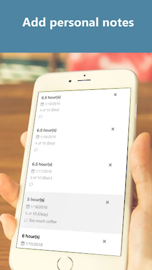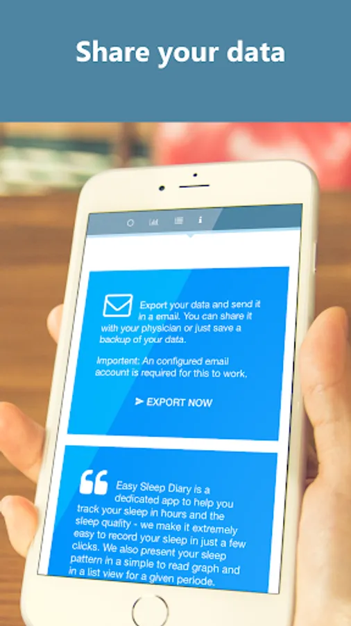 Simple Sleep Diary is a dedicated app to help you track your sleep in hours and the sleep quality - we make it extremely easy to record your sleep in just a few clicks. We also present your sleep pattern in a simple to read graph and in a list view for a given periode. You can also share your data or make a backup.