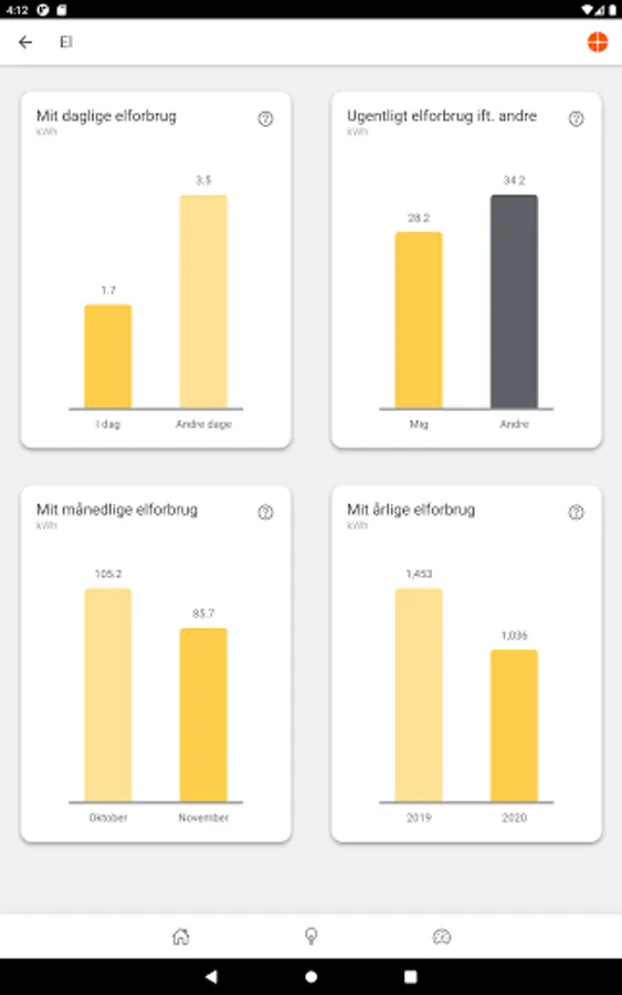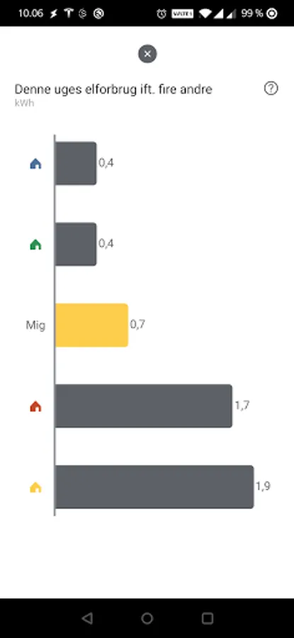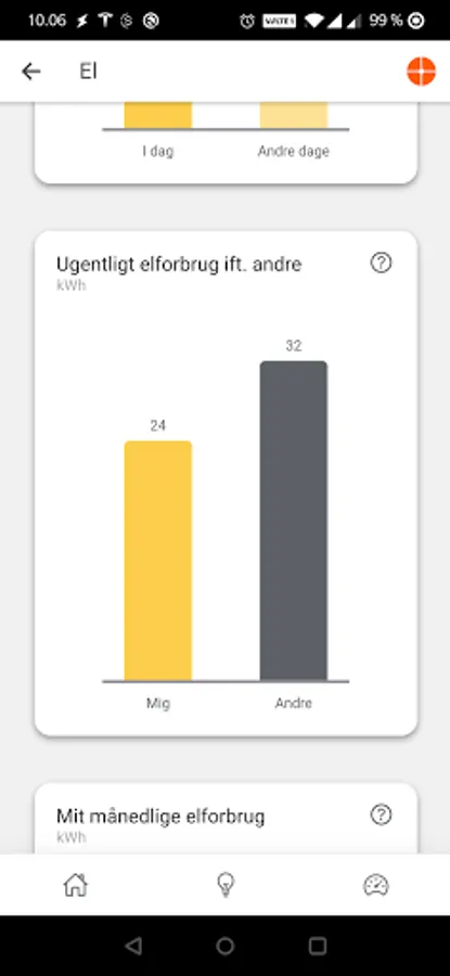 - Select from the overview the consumption you want to see (electricity, cold water, hot water, heat). Under each consumption you can see your daily, weekly, monthly and annual consumption. Your weekly consumption is shown compared to other apartments that match yours in resident composition, whereas the others show you your consumption day by day, month by month and year by year.