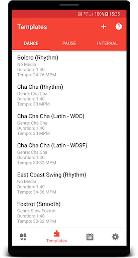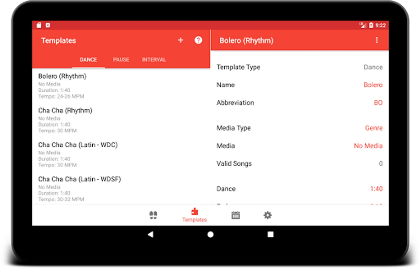 - 31 pre-defined templates (29 dances, 1 generic pause and 1 generic interval)
