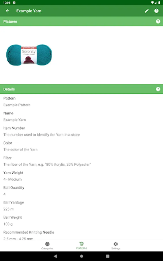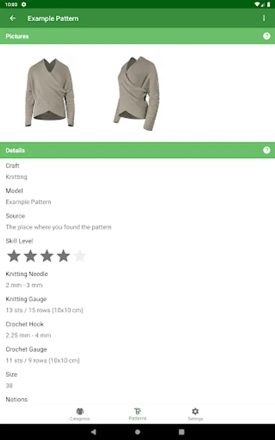 Using the camera, you can supply your pattern details with pictures of the model, the instructions, or perhaps of the finalized garments. You can add as many pictures as you like, both for your categories, your patterns and your yarn.