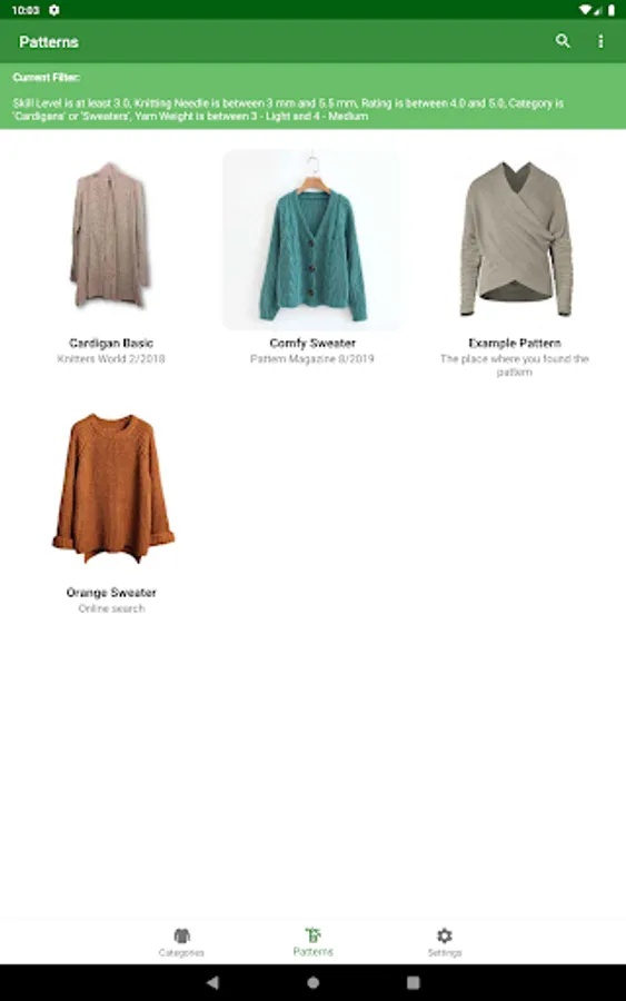 The app lets you gain the perfect overview in a single place, whether your patterns are purchased, found in magazines, or your own creations entirely. You can categorize your patterns based from standard garment types, or create as many of your own categories as you like. You can have your patterns sorted alphabetically, by most recent usage, or in any particular order you like. Each pattern can be associated with as many categories as you wish.