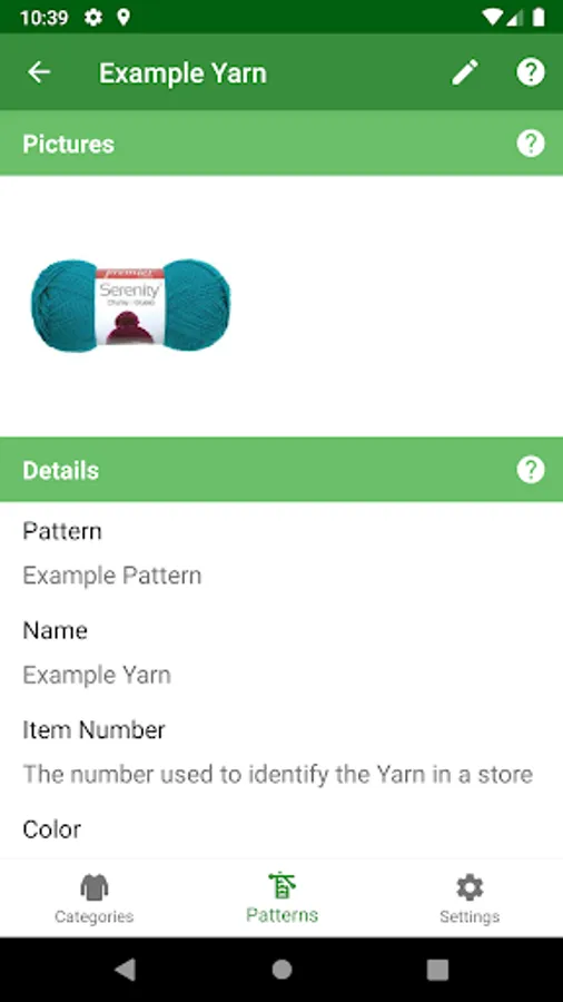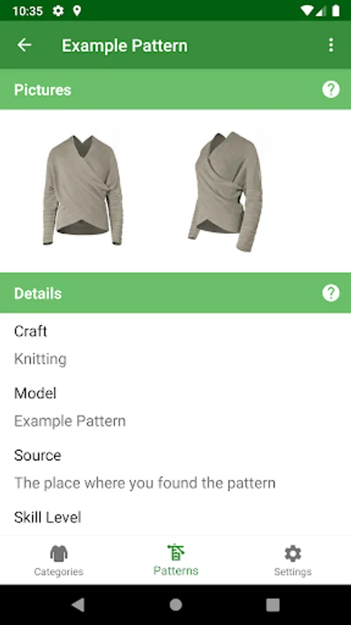 Using the camera, you can supply your pattern details with pictures of the model, the instructions, or perhaps of the finalized garments. You can add as many pictures as you like, both for your categories, your patterns and your yarn.