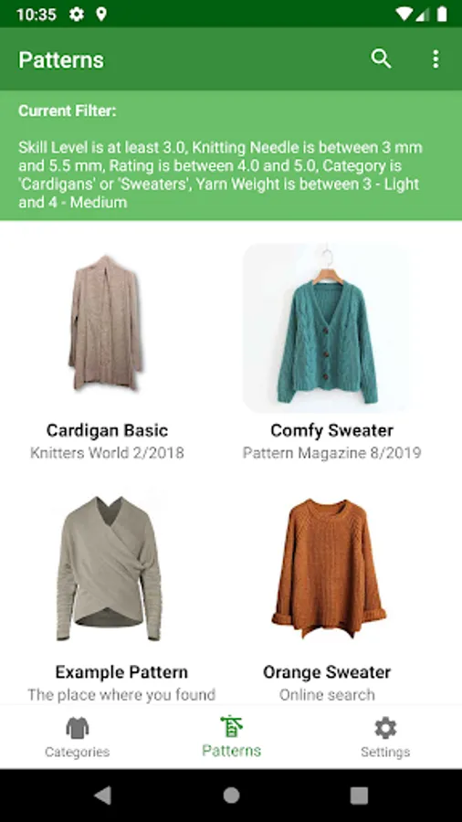 The app lets you gain the perfect overview in a single place, whether your patterns are purchased, found in magazines, or your own creations entirely. You can categorize your patterns based from standard garment types, or create as many of your own categories as you like. You can have your patterns sorted alphabetically, by most recent usage, or in any particular order you like. Each pattern can be associated with as many categories as you wish.
